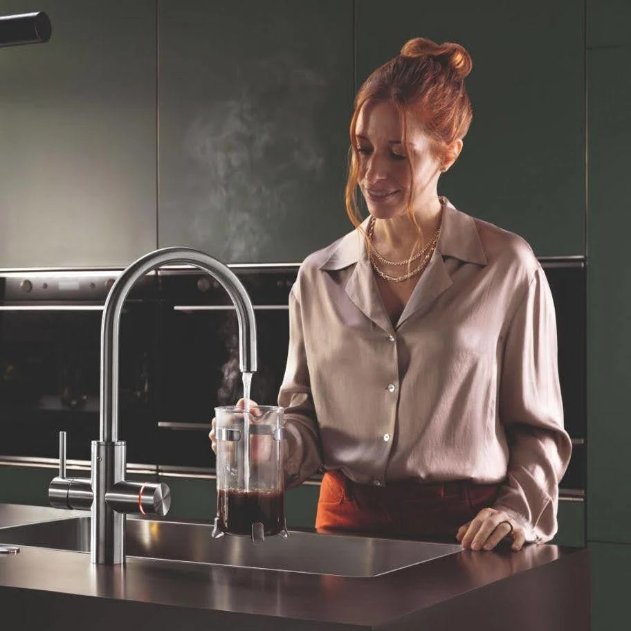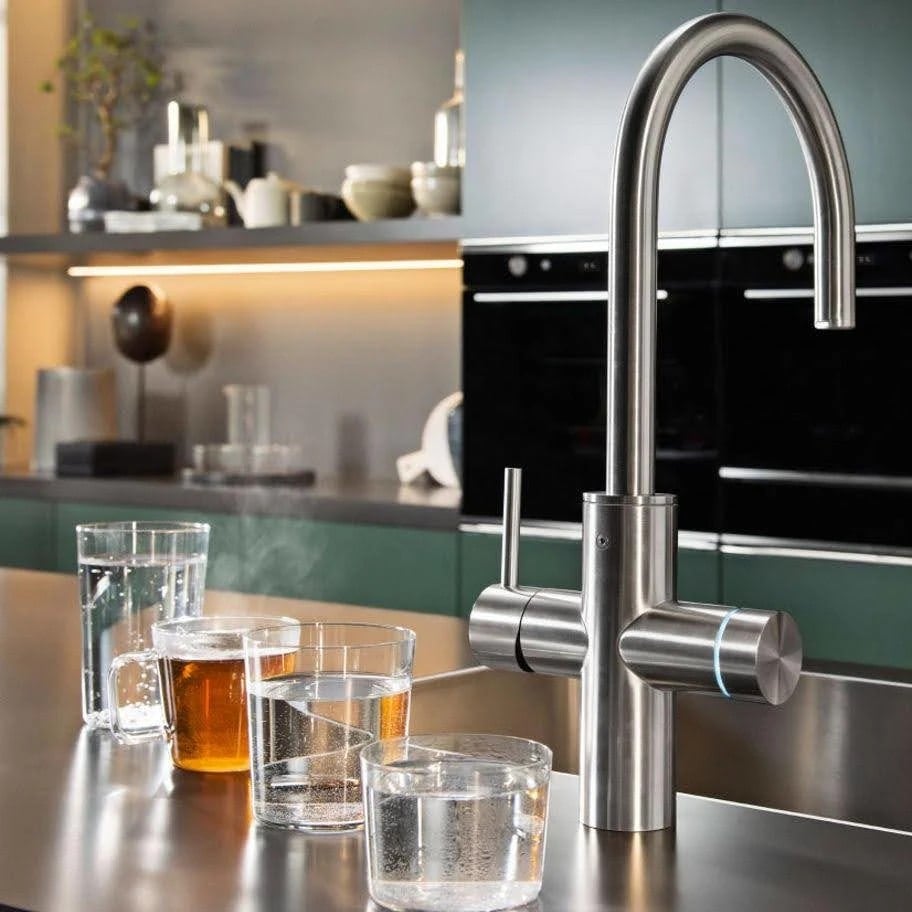 Un alt produs extrem de interesant este bateria Franke Mythos Water Hub Sparkling. Acest sistem avansat 6în1 înlocuiește complet robinetele tradiționale de bucătărie, oferind acces la apă standard (caldă și rece) și patru tipuri de apă filtrată: carbogazoasă, răcită, la temperatura camerei și clocotită.