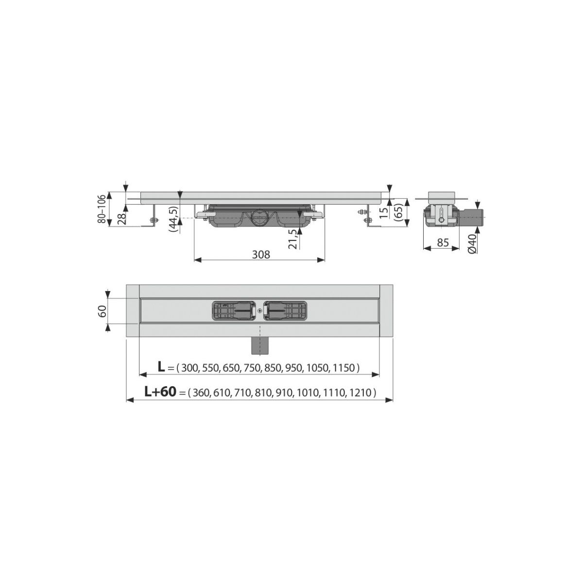 - înălțimea totală a instalației: 80 - 106 mm