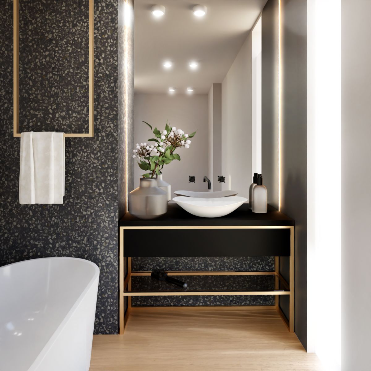 Consola de baie, este una dintre cele mai performante piese de mobilier de baie. Înlocuiește perfect dulapurile obișnuite de sub tejghea. Modernistă, realizată din oțel, adaptată pentru utilizarea în baie. Produsul poate fi folosit ca piesă de mobilier pe care va fi așezat lavoarul sau poate face parte de sine stătător din mobilierul de baie. Consola este fabricată din materiale de cea mai bună calitate. Este sudată în întregime, datorită căreia, ca piesă de mobilier, se caracterizează printr-o stabilitate extraordinară. Structura este realizată din oțel, vopsită cu lacuri rezistente la coroziune. Blatul este realizat din carton acrilic cu protecție adecvată împotriva umidității. Partea frontală a consolei este acoperită de o grilă realizată din carton acrilic. Forma simplă, combinată cu culoarea aurie a ramei, face ca produsul să fie potrivit pentru interioarele glamour, moderne și art deco.