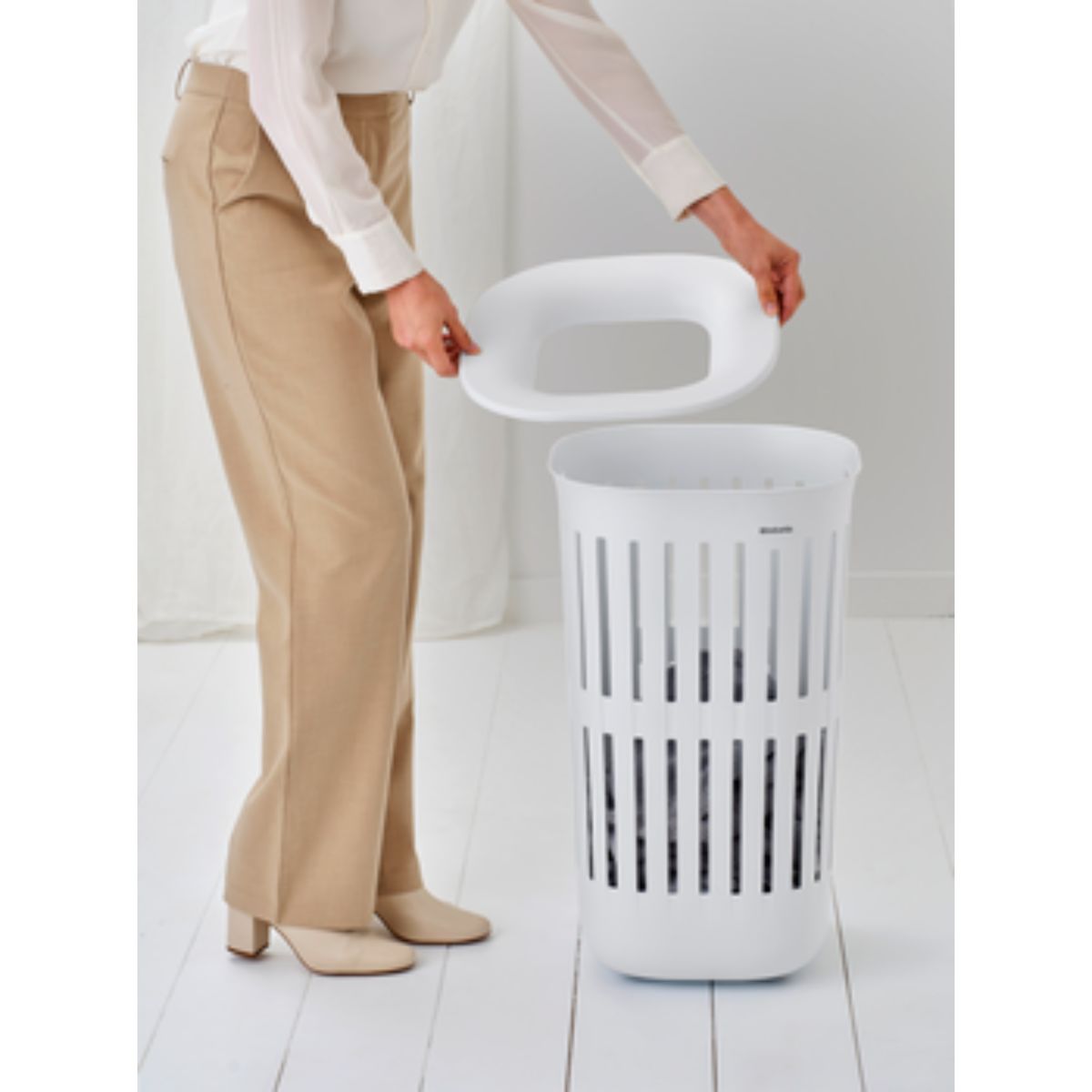 Coșul de rufe Collect-It de la Brabantia, cu o capacitate de 55 l, face ca spălatul rufelor să fie mai ușor și să arate mai bine. Datorită designului său zvelt, coșul se potrivește perfect într-un colț al camerei sau lângă perete. Datorită capacului cu deschidere Quick-Drop, poți introduce cu ușurință hainele. E timpul să speli rufele? Pentru a stabiliza coșul, folosește mânerul lateral confortabil și scoate capacul. Acest coș de rufe elegant este fabricat din plastic 100% reciclat și este prevăzut cu orificii de aerisire inteligente, care permit rufelor să respire. Și arată la fel de elegant! Un coș excelent pentru dormitor, baie sau spălătorie.