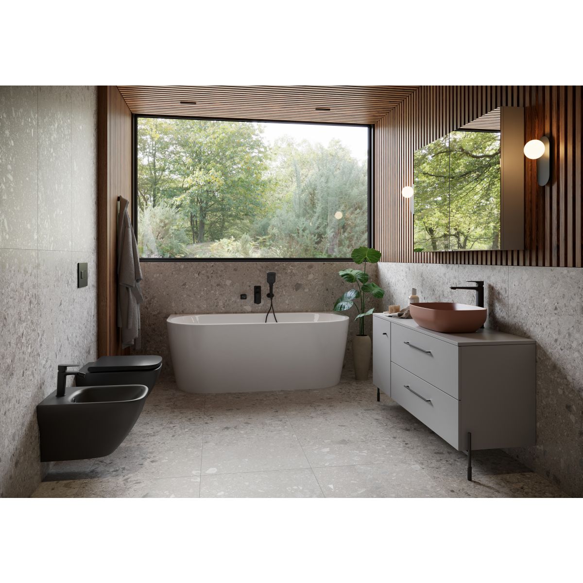 Vasul mural LARGA SQUARE cu sistem de montare ascuns îmbunătățește estetica și simplifică instalarea ceramicii. Suprafața mată antracit a vasului de toaletă se îmbină perfect cu lavoarele mate din colecția LARGA. Ceramica are proprietăți antibacteriene deoarece a fost rafinată cu ioni de argint - SILVER PROTECT. Vasul LARGA OVAL a fost proiectat fără flanșă, cu tehnologia inovatoare CleanOn. Datorită acestei soluții, apa spală eficient toate suprafețele interne ale vasului, iar toaleta rămâne mai curată și mai igienică pentru mai mult timp. Este dotată cu un scaun SLIM WRAP din duroplastic mat, al cărui design simplu asigură o curățare ușoară, în timp ce soluția inovatoare de scoatere ușoară cu un singur buton permite scoaterea rapidă și ușoară a scaunului prin apăsarea unui buton. Funcția de cădere liberă va asigura coborârea treptată a scaunului, împiedicându-l să lovească brusc vasul. Produsul este adaptat pentru a fi instalat cu cadrul de instalare ascuns AQUA.