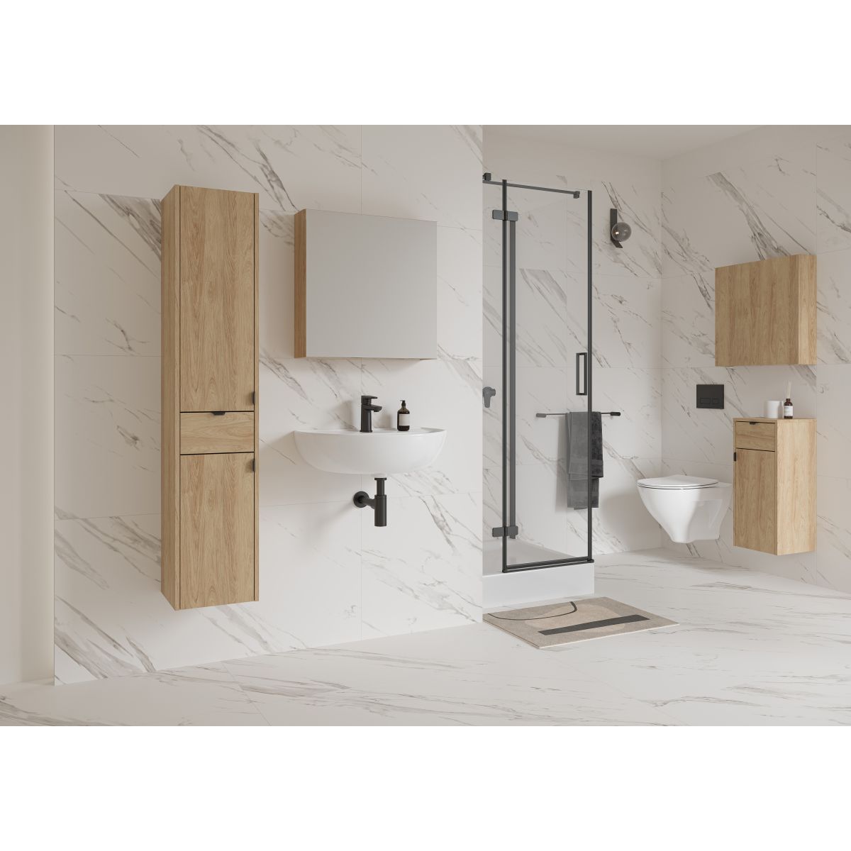 - Mecanismul soft close asigură închiderea silențioasă și lină a ușilor, sporind confortul utilizării zilnice. Mânerul ascuns, în locul celui clasic, subliniază caracterul modern și minimalist al mobilierului. Fața și corpul sunt realizate din plăci aglomerate laminate în culoarea stejarului hickory, ceea ce garantează durabilitate, finisaj estetic și ușurință în întreținere. Posibilitatea de montare a ușilor în versiunea dreapta sau stânga permite adaptarea dulapului la dispunerea băii. Mobilierul este destinat asamblării de către utilizator și beneficiază de o garanție de 2 ani.