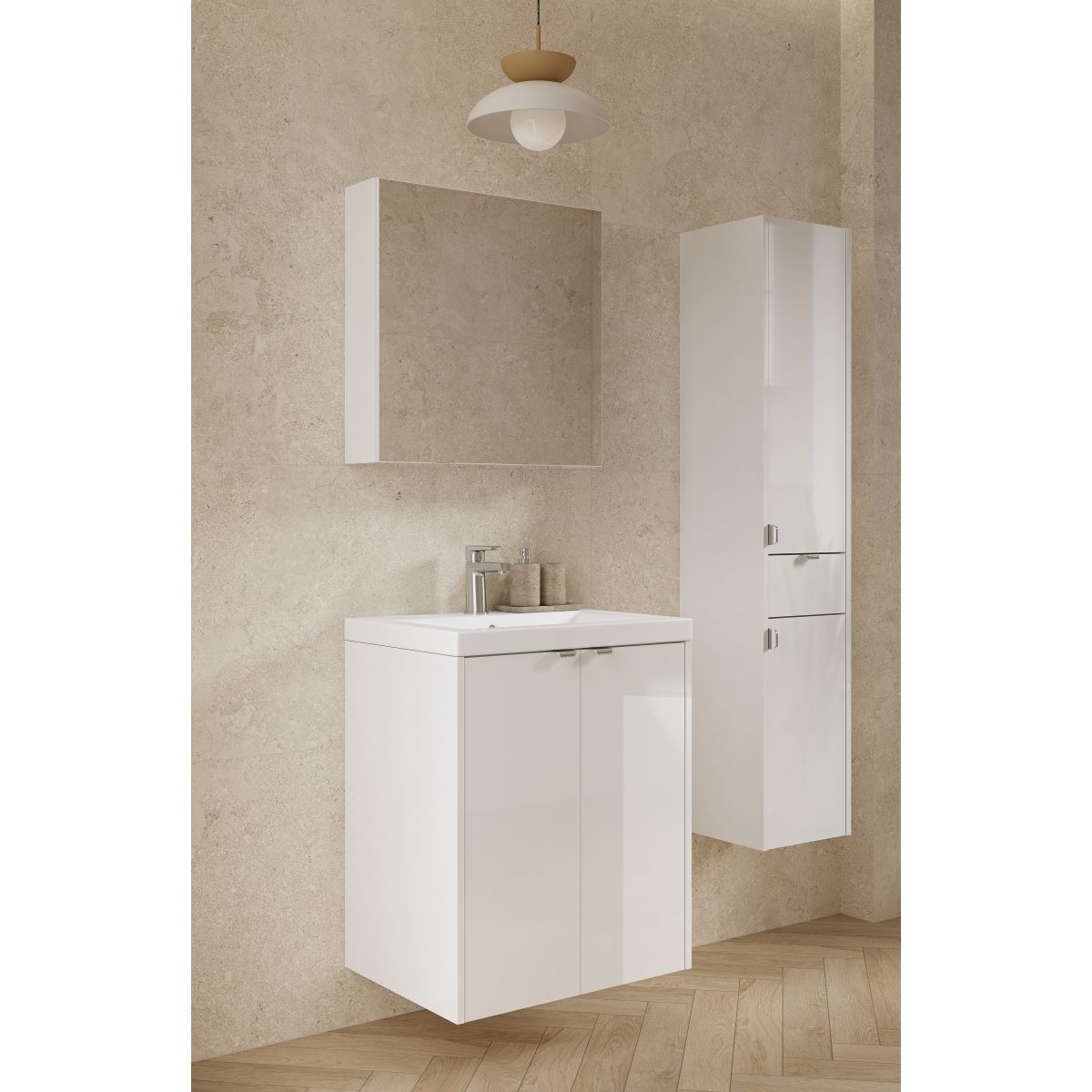 - Setul OVIDA 50 în culoarea albă (dulap sub chiuvetă + chiuvetă din ceramică) reprezintă o soluție universală și estetică pentru baie. Culorile luminoase și atemporale conferă interiorului prospețime și lejeritate, integrându-se perfect atât în amenajările moderne, cât și în cele clasice. Dulapul este prevăzut cu două uși și un raft interior, ceea ce asigură un spațiu confortabil pentru depozitarea produselor cosmetice, a produselor de îngrijire și a accesoriilor de baie.
