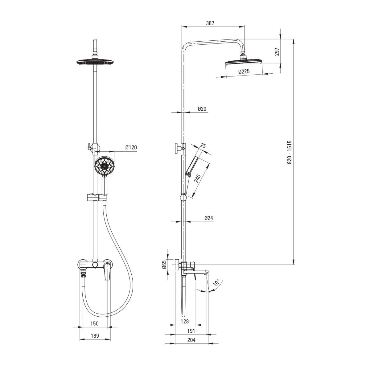 - Inclus: baterie cu comutator, duș ploaie, duza de cadă, duș de mână, furtun de duș, tija de duș