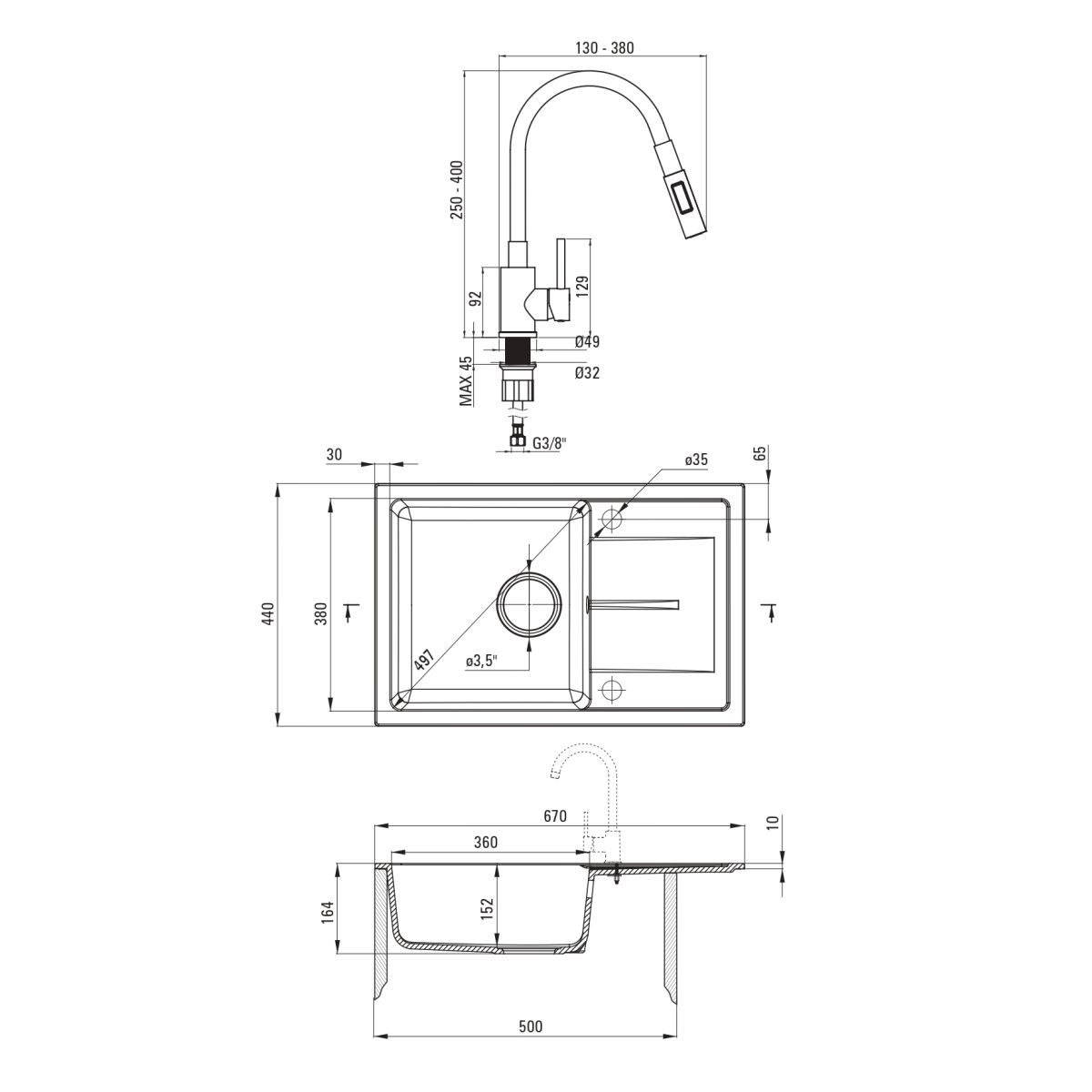 Un set de bucătărie elegant și funcțional care combină durabilitatea unei chiuvete din granit cu confortul unui robinet mixer flexibil. Chiuveta metalică din grafit are o cuvă încăpătoare și este reversibilă, astfel încât se va potrivi în orice bucătărie. Rezistentă la impact, căldură, decolorare și șoc termic, va dura ani de zile fără a-și pierde culoarea sau estetica. Setul este completat de un mixer cu gura de scurgere curbată într-o culoare neagră elegantă. Aspectul său modern merge mână în mână cu funcționalitatea - designul flexibil permite umplerea convenabilă a vaselor mari și curățarea ușoară a chiuvetei. O caracteristică suplimentară este dușul de mână cu 2 funcții, care vă permite să comutați între un jet aerat și un duș de ploaie - ideal pentru clătirea legumelor sau fructelor. Aeratorul integrat face ca jetul să fie moale și economic, ceea ce se traduce printr-un confort sporit și un consum redus de apă. Acest set este soluția ideală pentru cei care caută o soluție fiabilă și plăcută din punct de vedere estetic pentru utilizarea zilnică în bucătărie.