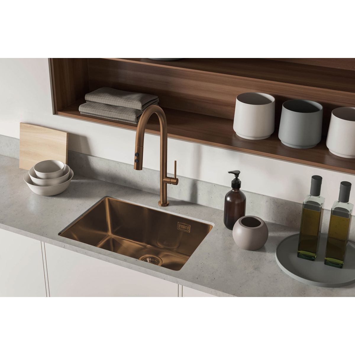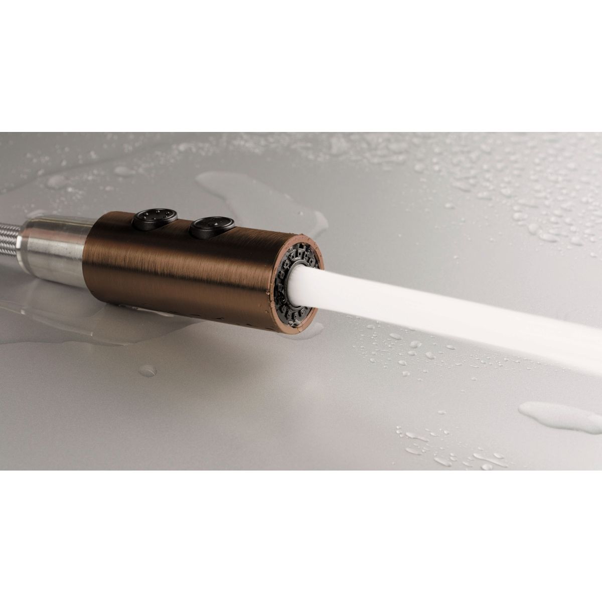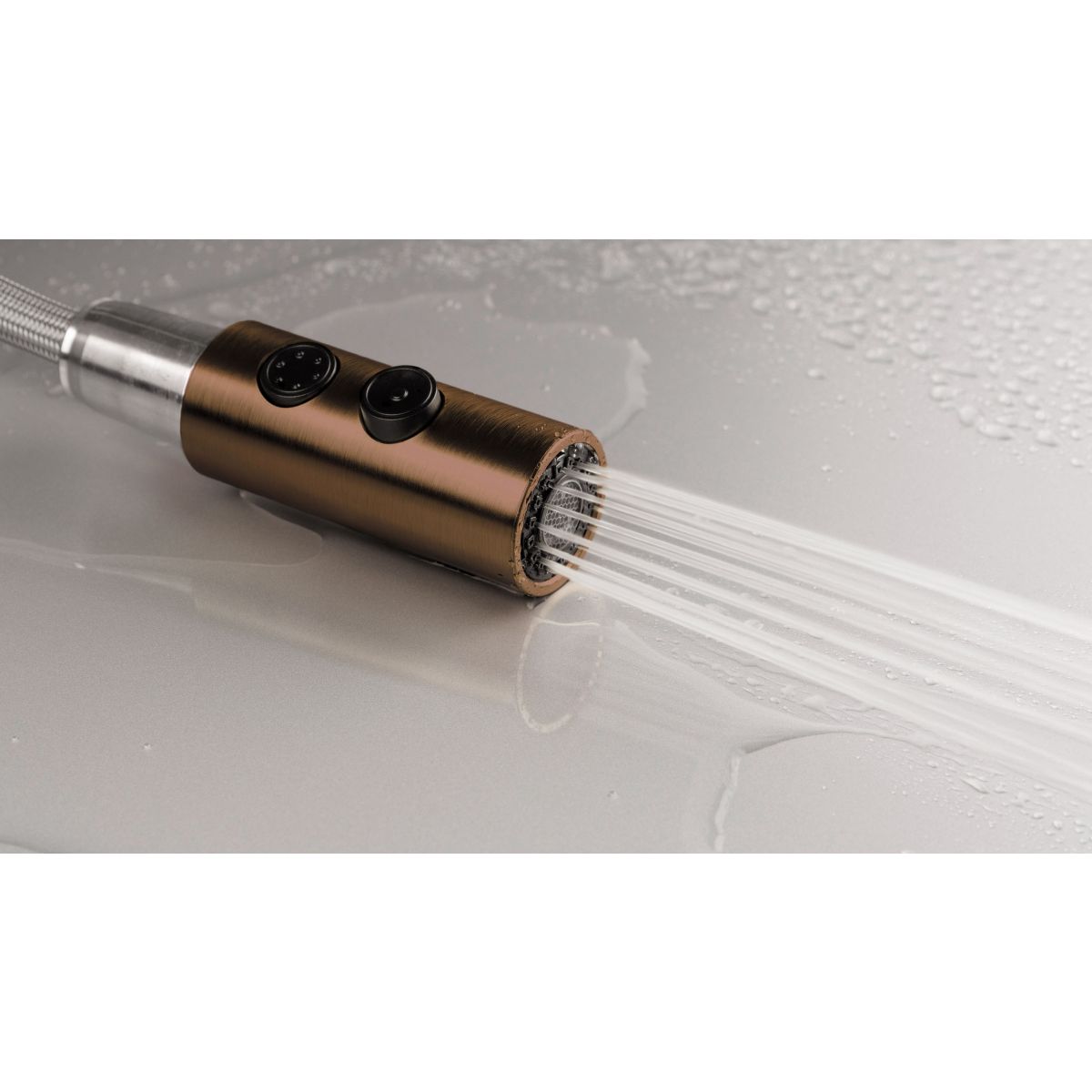 Robinetul de bucătărie Olfato combină stilul și funcționalitatea, satisfăcând perfect nevoile unei bucătării moderne. Gura de scurgere extensibilă face extrem de ușoară menținerea ordinii în zona chiuvetei. Duza cu dublă funcție, cu opțiuni de pulverizare aerată și ploaie, oferă flexibilitate pentru sarcinile zilnice, cum ar fi spălarea vaselor sau clătirea fructelor și legumelor. Finisajul din bronz periat adaugă căldură și eleganță încăperii.
