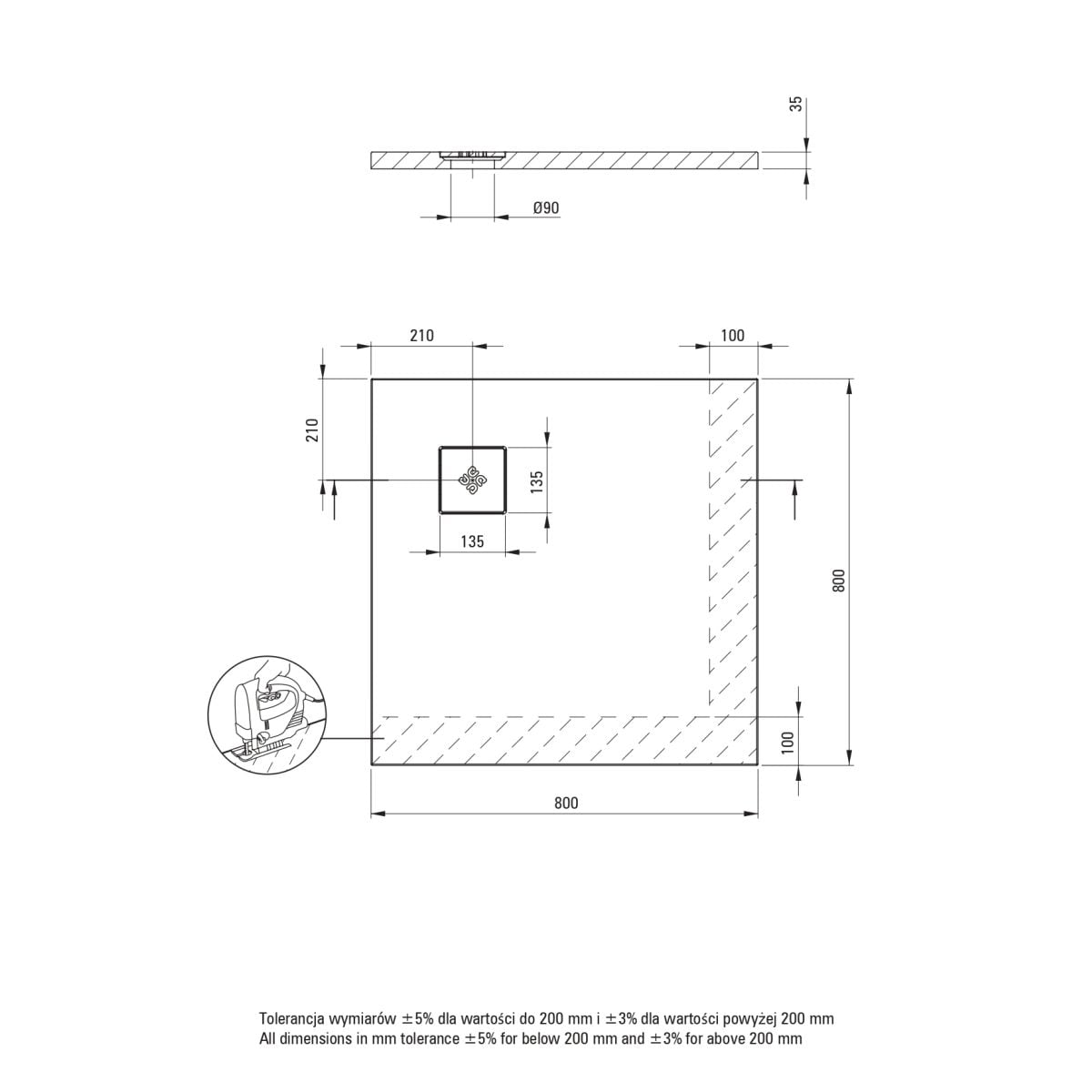 - Tehnologie SOLID PLUS - umplere compozită, posibilitatea de tăiere a căzii de duș în zona marcată pe desen