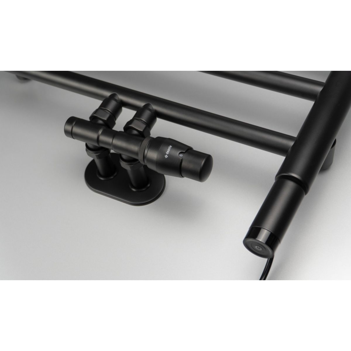 Radiatorul de baie cu un finisaj elegant negru mat, care măsoară 850x500, este caracterizat de liniile sale rotunjite și estetica unică. Este echipat cu un cârlig practic pentru prosop sau halat de baie, ideal pentru băile moderne. Este un model hibrid: apă/electric, cu posibilitatea de a instala un încălzitor opțional de 400W pentru căldură suplimentară sau uscare rapidă a prosoapelor în afara sezonului de încălzire. Pentru încălzitor trebuie achiziționată o supapă. Atât încălzitorul opțional, cât și valva necesară sunt disponibile în aceeași culoare ca și radiatorul.