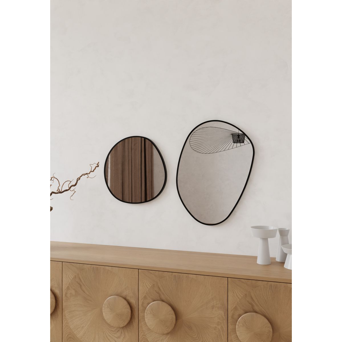 Oglindă cu formă neregulată într-un cadru negru din aluminiu periat. Adâncimea ramei este de 2,3 cm. Oglinda poate fi agățată vertical sau orizontal.