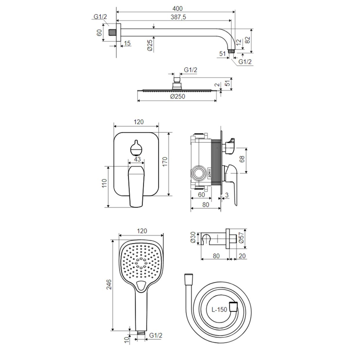 - Inclus: baterie cu comutator, duș ploaie, duș de mână, furtun de duș, suport de duș, braț de duș, conexiune unghiulară