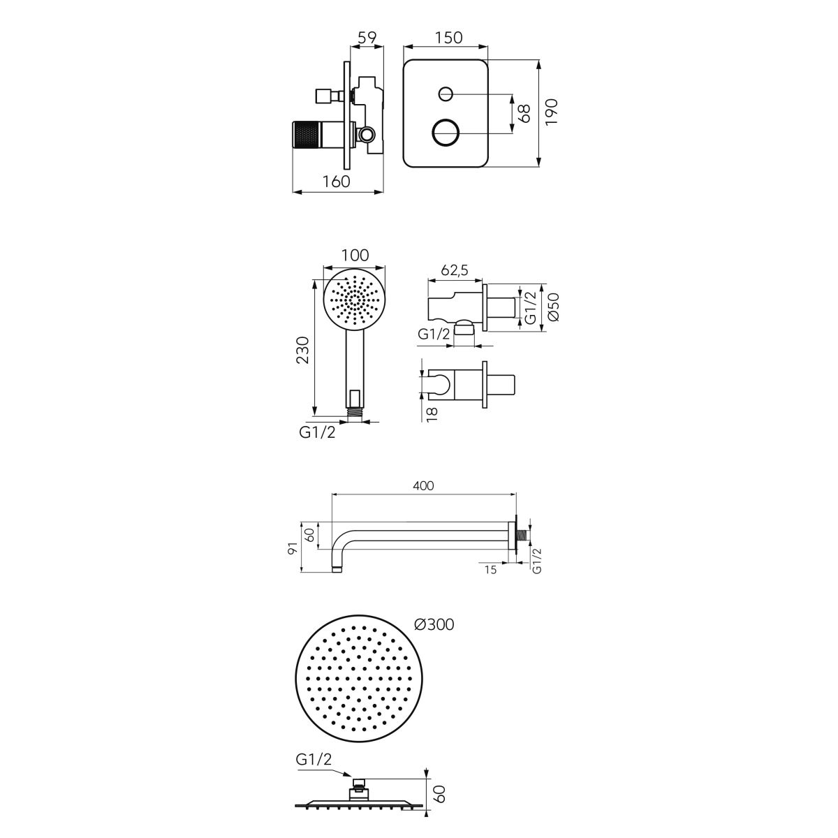- Inclus: baterie cu comutator, duș ploaie, duș de mână, furtun de duș, conexiune unghiulară