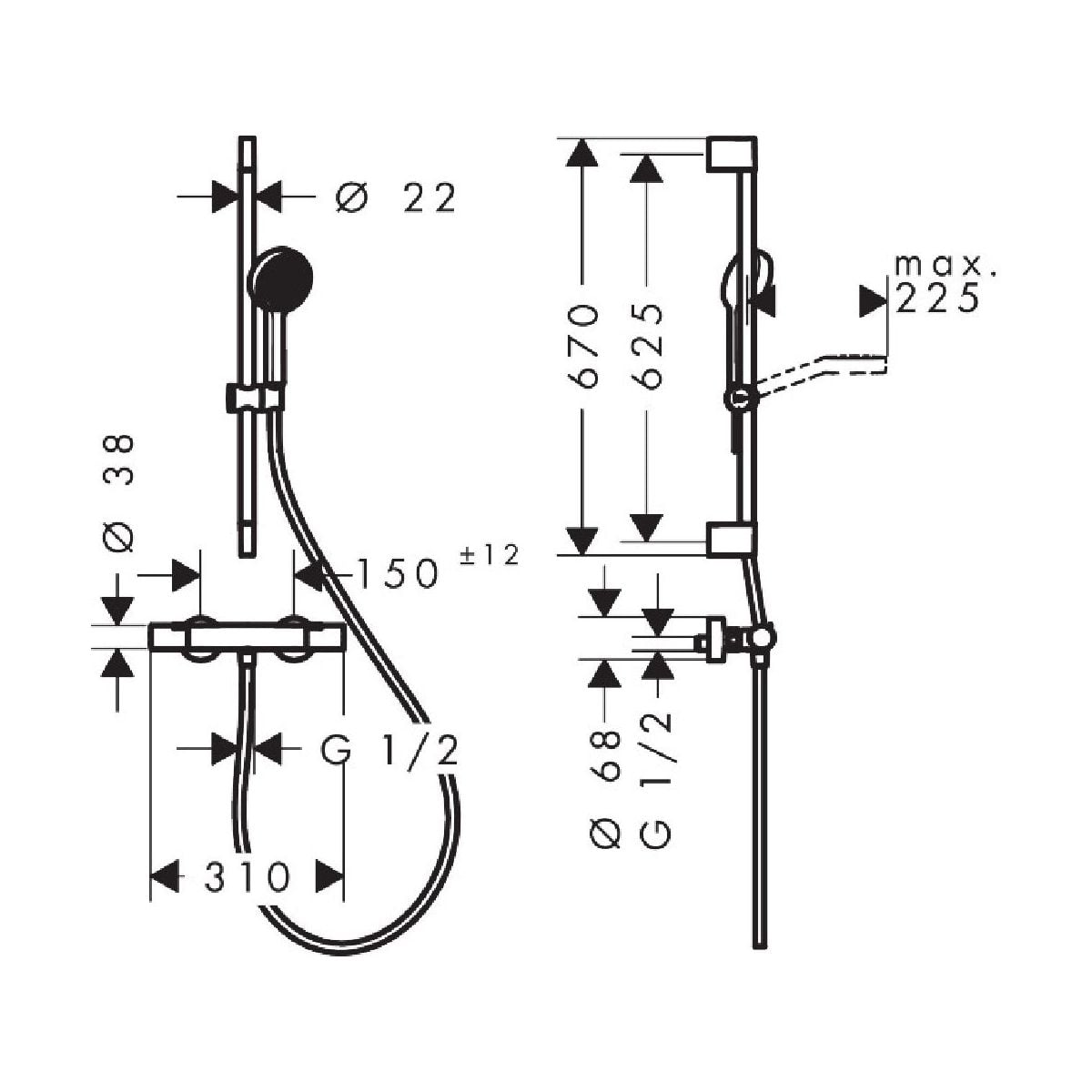 - diametrul tijei de duș: 22 mm