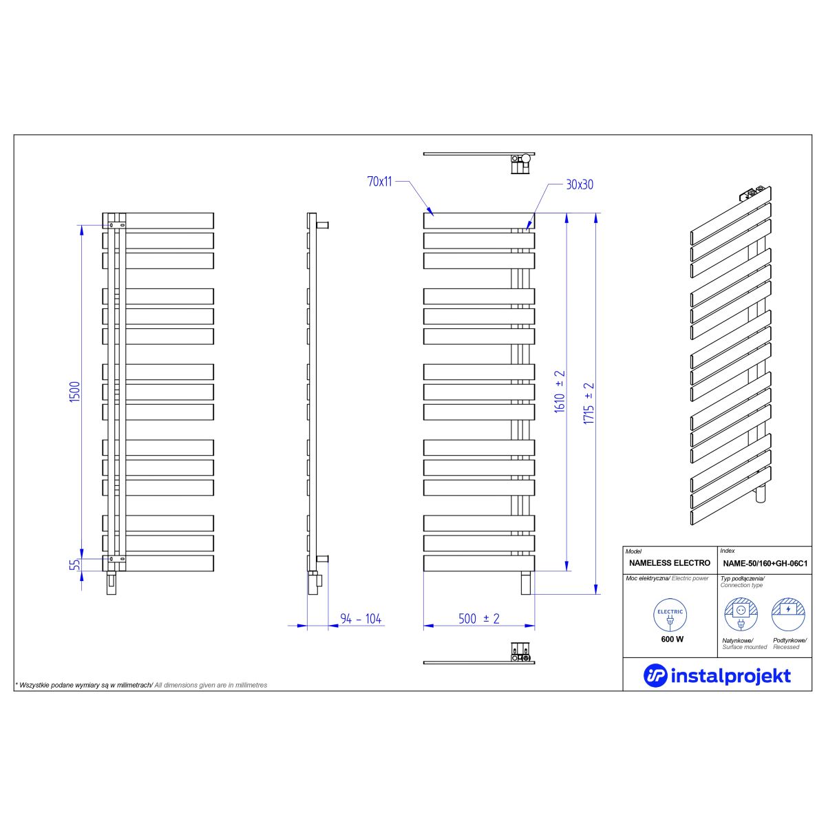 Instal Projekt Nameless Electro încălzitor electric 161x50 cm negru NAME-50/160C75+GH-06C2