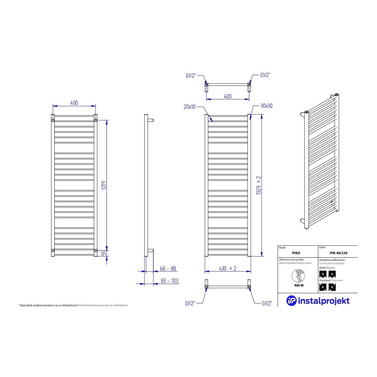 - distanța dintre conexiuni: 400 mm