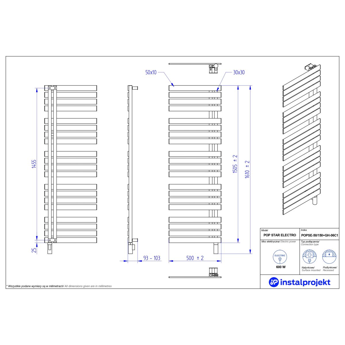 Instal Projekt Pop Star Electro încălzitor electric 150.5x50 cm negru POPSE-50/150C31+GH-06C2