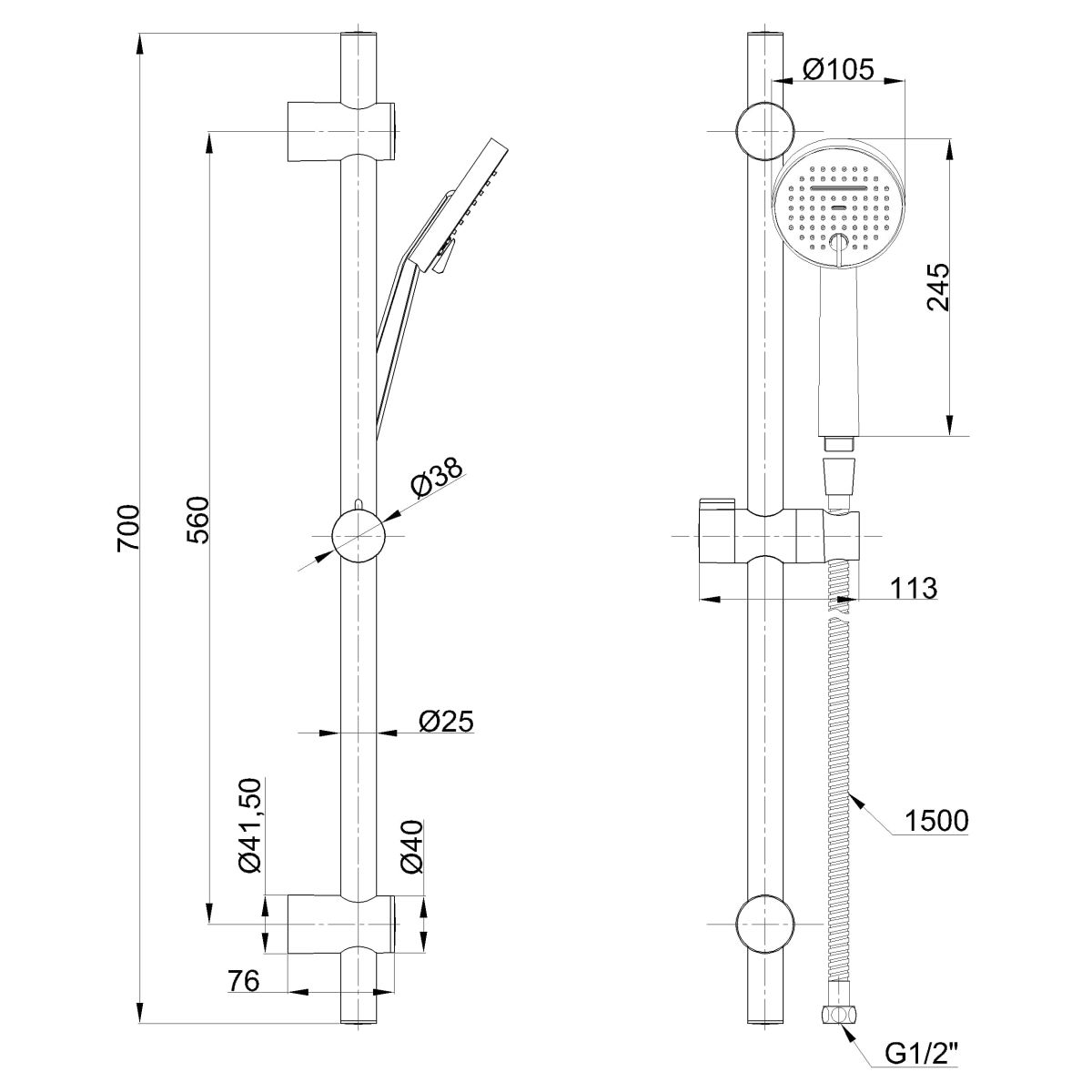 Inclus: duș de mână, furtun de duș, tija de duș