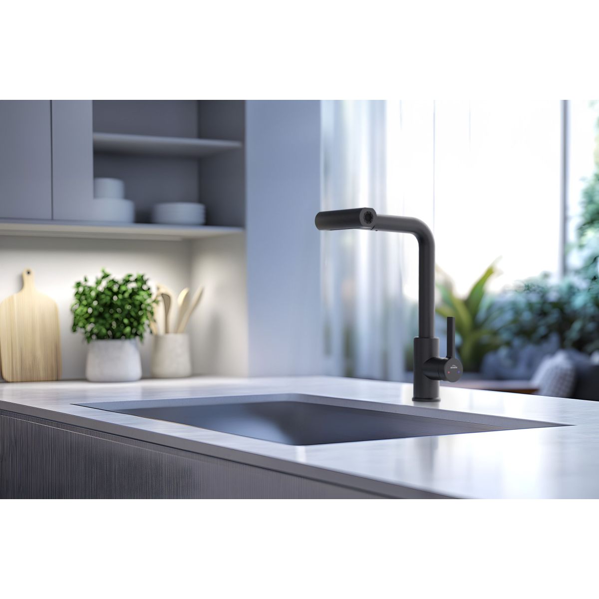 Robinetul mixer este echipat cu o gură pivotantă la 360 °, care vă permite să utilizați unul dintre cele patru moduri de pulverizare disponibile: normal, cascadă, duș și pulverizare. Puteți ajunge cu ușurință în fiecare colțișor al chiuvetei, plus că obțineți un confort sporit în timpul treburilor zilnice din bucătărie. Disponibil în două dintre cele mai populare culori: crom și negru, îi conferă un aspect atemporal, elegant, care se potrivește atât interioarelor moderne, cât și celor clasice.