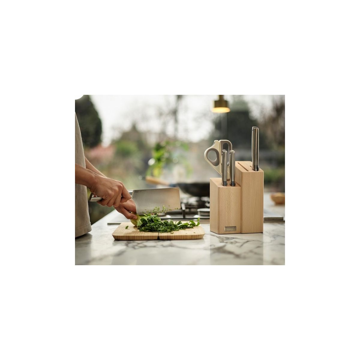 - include: cuțit pentru fructe (9 cm), cuțit zimțat (11 cm), cuțit Santoku (14 cm), satâr (16 cm), foarfece, bloc din bambus,