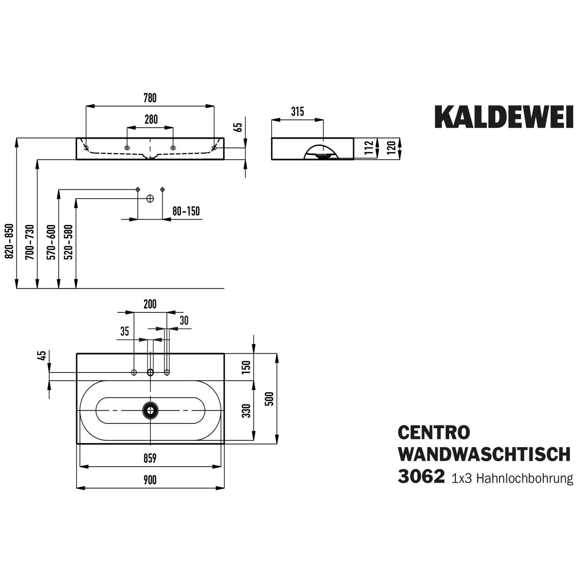 Kaldewei Centro lavoar 90x50 cm dreptunghiular clasică alb 903506033001