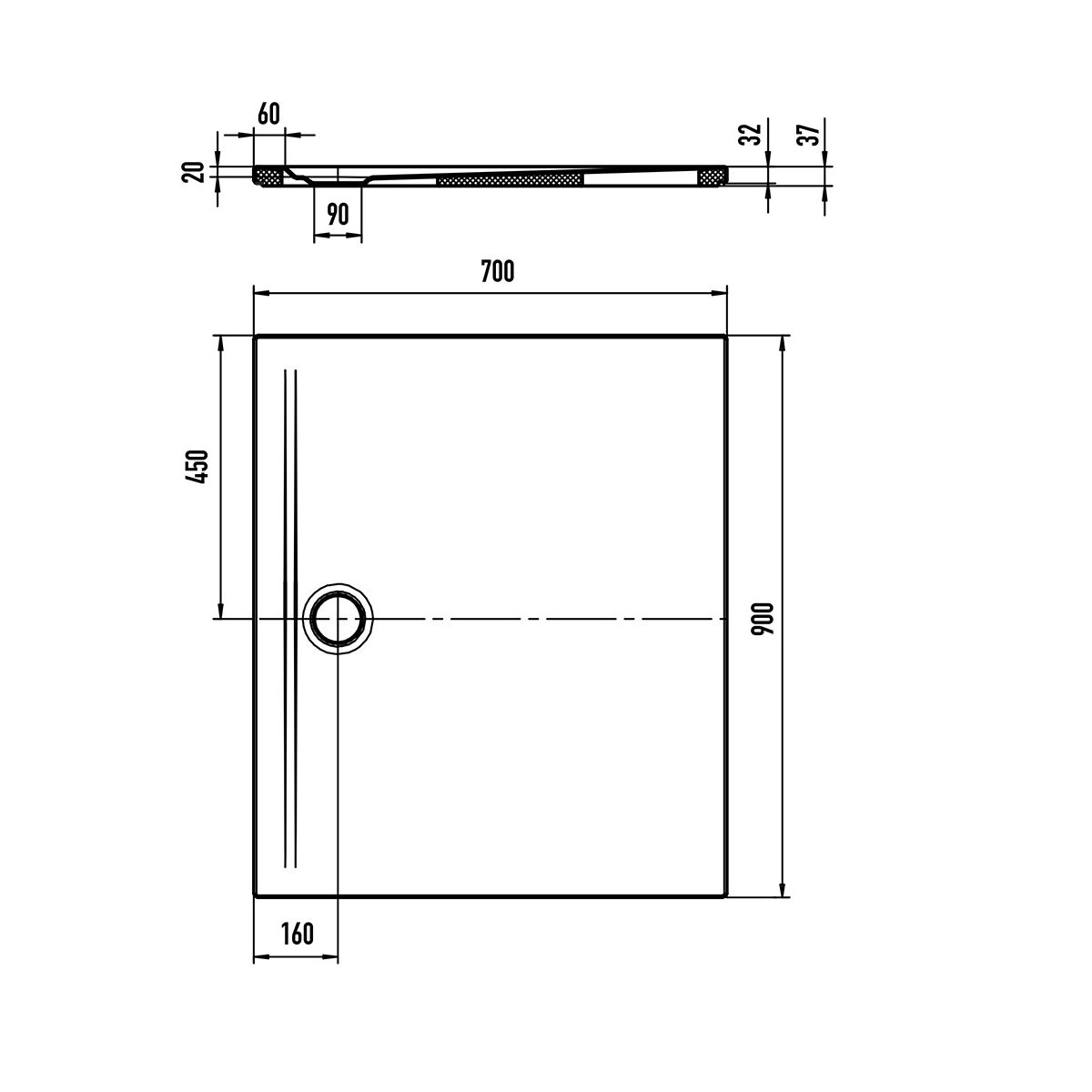 Tavă de duș plană cu un design foarte modern, cu scurgerea situată în mijlocul laturii lungi. Suprafață în picioare spațioasă și omogenă. Poate fi combinată cu un capac de scurgere cromat sau cu un capac de scurgere emailat, în aceeași culoare cu a tăvii de duș (vândut separat). Tavă de duș completă cu suport de polistiren coborât. În cazul în care există o lipsă de spațiu în podea, este ideală și pentru cabine cu margini.