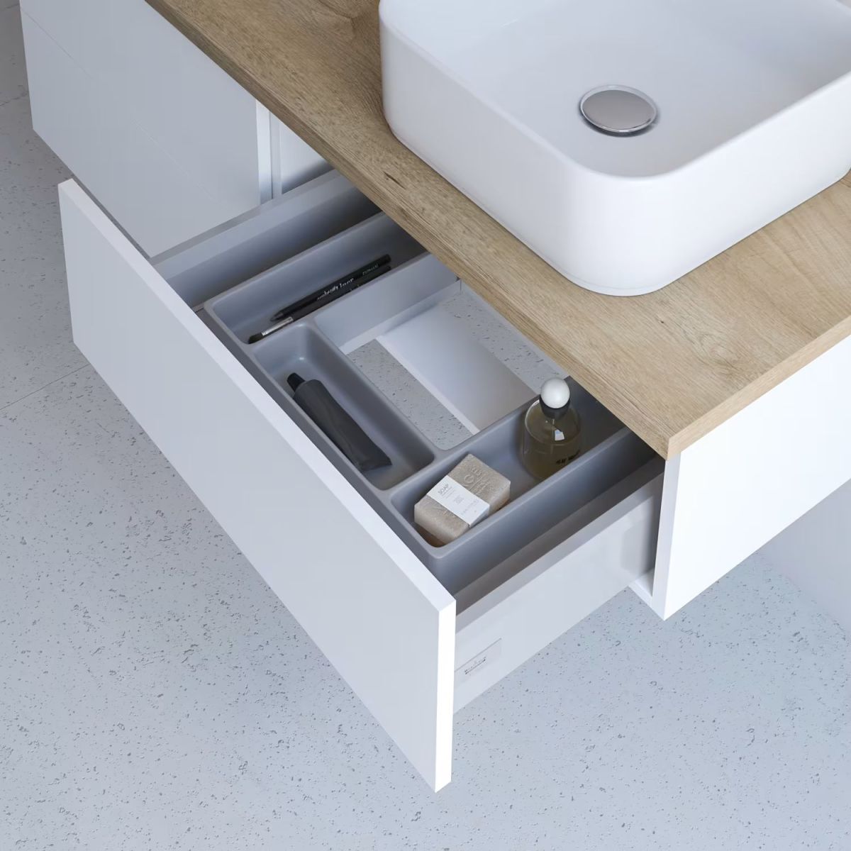 - Interiorul este în general tonic și include sertare Blum ANTARO și sertare cu extensie totală în gri orion cu inserții cosmetice în culori asortate.