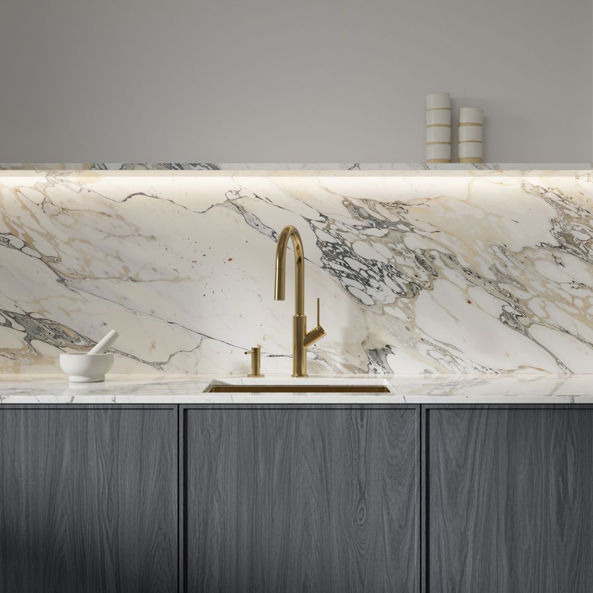 Alamă periată este o finisare nobilă într-o nuanță rece de auriu, cu o suprafață satinată, periată. Acoperirea este realizată folosind tehnologia avansată PVD.