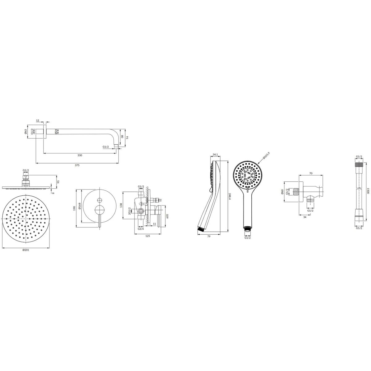 Inclus: baterie cu comutator, duș ploaie, duș de mână, furtun de duș, braț de duș, conexiune unghiulară