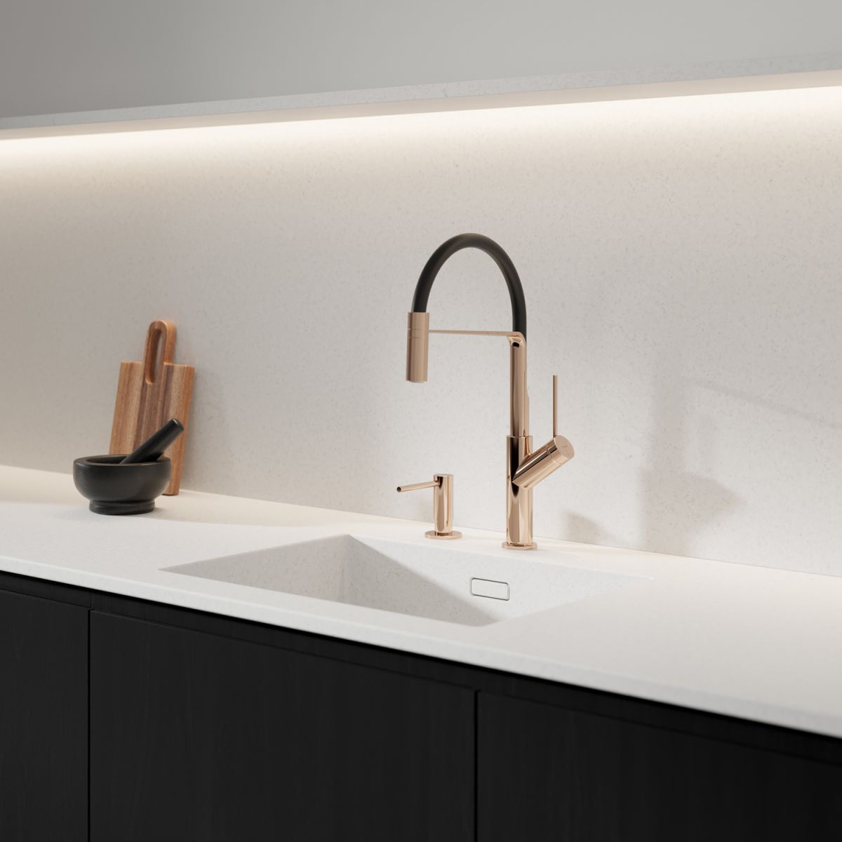Mixerul de bucătărie OMNIRES VITA este o combinație de formă rafinată și funcționalitate superioară. Designul său modern și minimalist se bazează pe forme geometrice arcuite, creând o siluetă ușoară și consistentă din punct de vedere vizual. Robinetul pivotant cu funcție de duș poate fi dezactivat, permițându-vă să direcționați cu precizie fluxul de apă în orice loc. Partea flexibilă din cauciuc de culoare neagră contribuie la confortul utilizării, iar înălțimea optimă a robinetului facilitează utilizarea zilnică. Modelul este echipat cu un cap ceramic high-end și soluții tehnologice inovatoare care reduc consumul de apă la jumătate, asigurând în același timp confort și ușurință în utilizare.