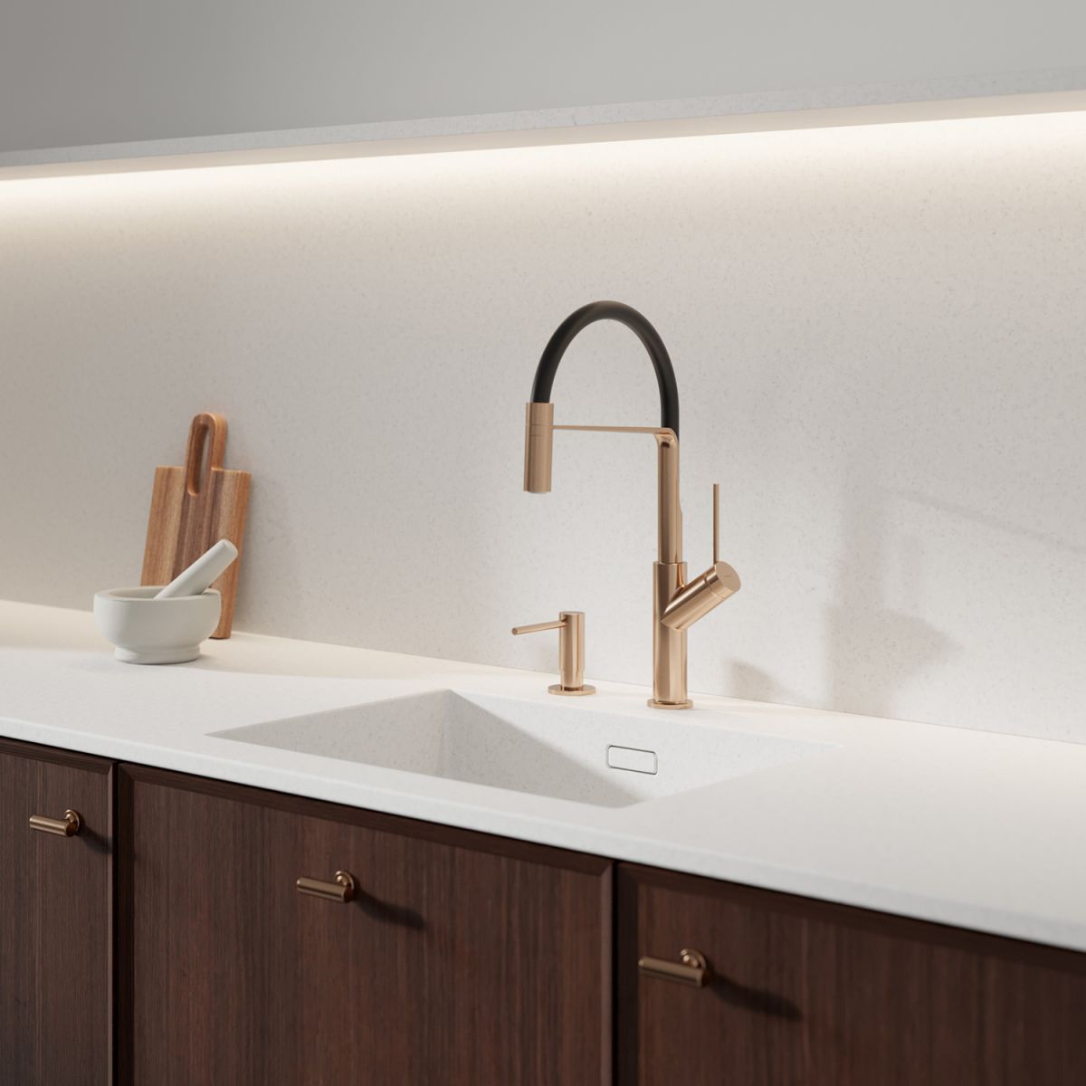 Mixerul de bucătărie OMNIRES VITA combină forma rafinată cu funcționalitatea superioară. Designul său modern și minimalist se bazează pe forme geometrice în arc, creând o siluetă ușoară și consistentă din punct de vedere vizual. Robinetul pivotant cu funcție de duș poate fi dezactivat, permițându-vă să direcționați cu precizie fluxul de apă în orice loc. Partea flexibilă din cauciuc de culoare neagră contribuie la confortul utilizării, iar înălțimea optimă a robinetului facilitează utilizarea zilnică. Modelul este echipat cu un cap ceramic high-end și soluții tehnologice inovatoare care reduc consumul de apă la jumătate, asigurând în același timp confort și ușurință în utilizare.