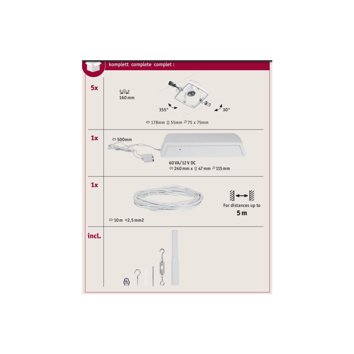 - include 5 corpuri de iluminat, cablu de 10 m, transformator, accesorii de montare