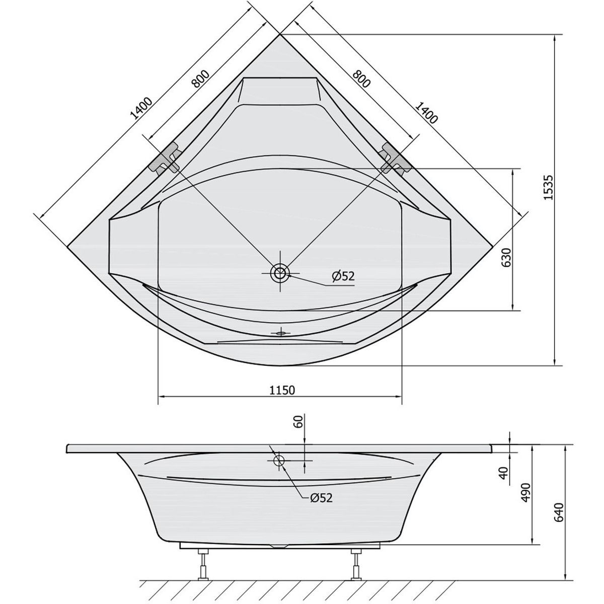 - diametrul de scurgere: 52 mm