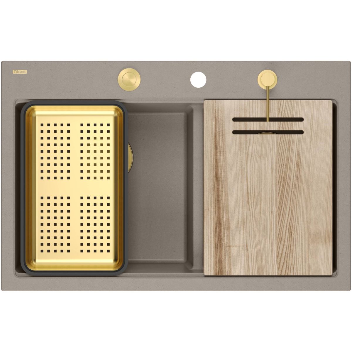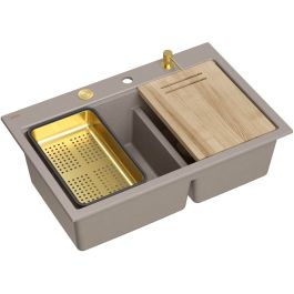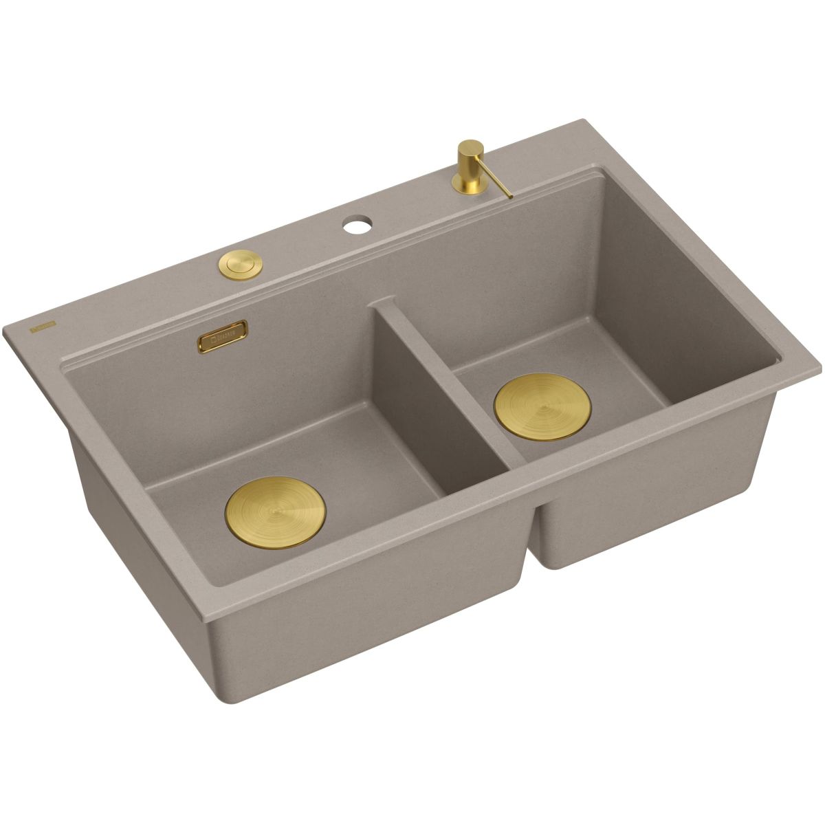 MARC 120 WORKSTATION GraniteQ Chiuvetă cu 2 căzi 760*500*235 mm soft taupe + sifon push to open + dozator + bord + inserție / elemente aurii