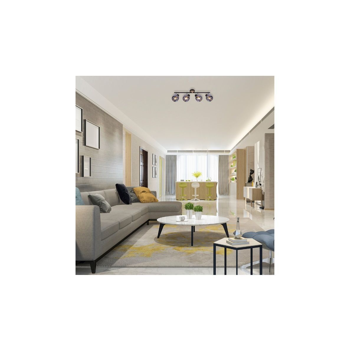 Spotul cvadruplu Salazar realizat dintr-o combinație de metal și sticlă este un accesoriu distinctiv pentru decorul în stil industrial al casei dvs. Îl recomandăm în special pentru camera de zi, dar îl puteți amplasa și în hol. Accesoriul său negru amintește de lemnul de stejar și este completat de o bază decorativă rotundă și o nuanță fumurie. Cele patru nuanțe sunt într-o singură linie, dar datorită capetelor reglabile puteți direcționa lumina pe care o emit.