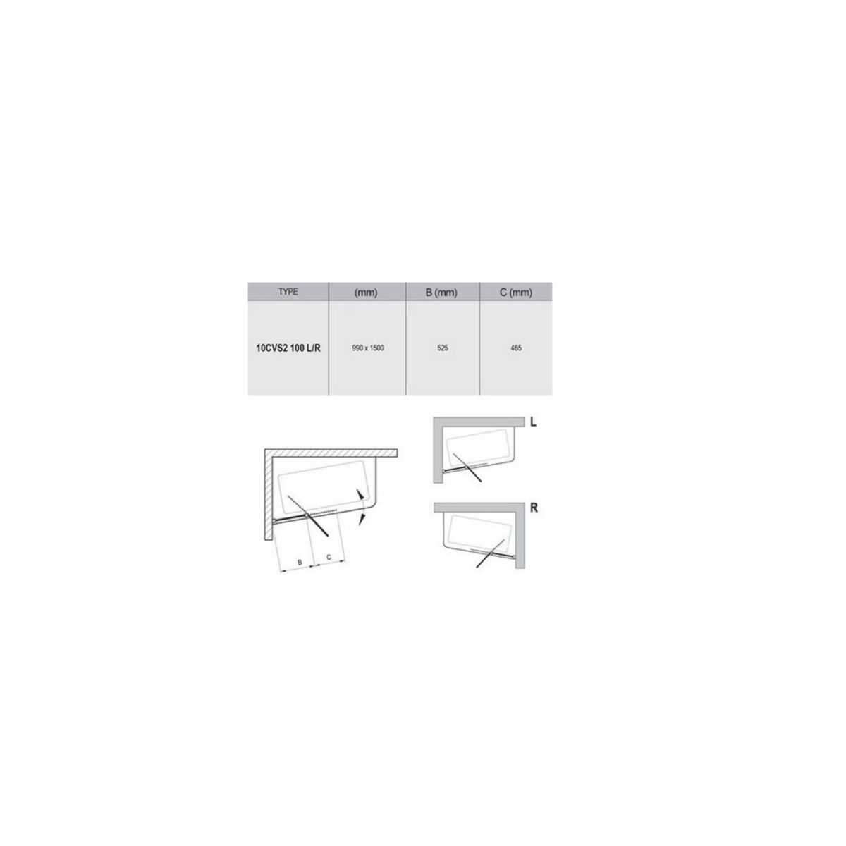 Paravan mobil din două piese pentru căzi de baie cu colț de 10°. În crom lucios cu umplutură din sticlă transparentă cu protecție Ravak AntiCalc®. Versiune stânga.