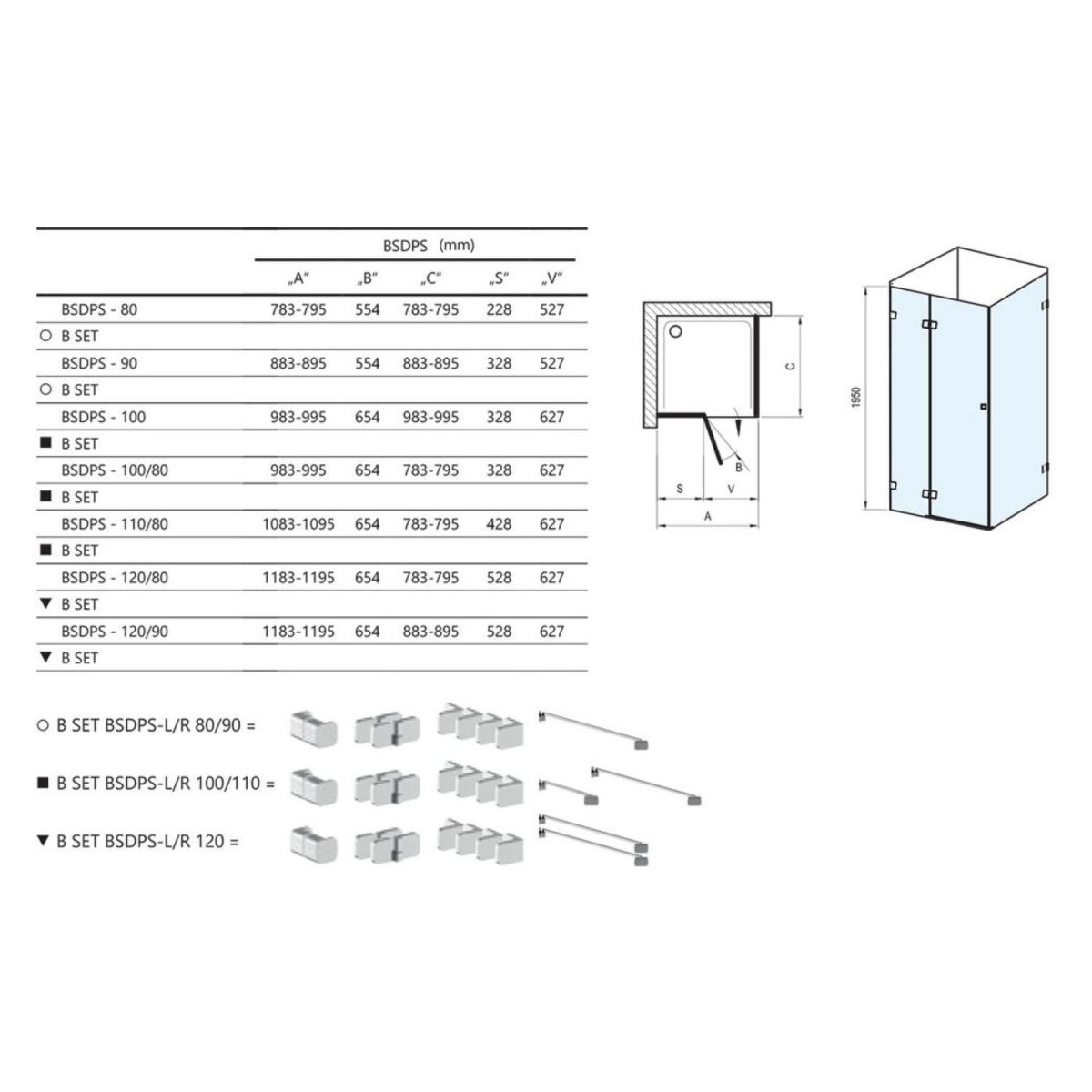 Cabina de duș este formată dintr-o ușă de duș din două părți (cu un element fix și un element mobil care formează ușa) și un perete fix dintr-o singură bucată. Versiunea stângă sau dreaptă a produsului este determinată de poziția balamalelor, privită din exterior. Mecanismul de ridicare blochează ușa în poziția de bază, o închide automat și o ridică deasupra pragului la deschidere. Versiunea cu sticlă pe partea stângă poate fi combinată numai cu SETUL B pe partea stângă. Instalare într-un colț cu gresie al băii pe o cadă de duș Ravak: Perseus Pro, Perseus Pro Flat, Perseus Pro Chrome sau direct pe podea cu un canal de scurgere liniar încorporat sau grătar de scurgere. Cabina de duș BSDPS este livrată ca set: elementele din sticlă într-un pachet și piesele metalice și un suport lung în al doilea pachet (B SET).