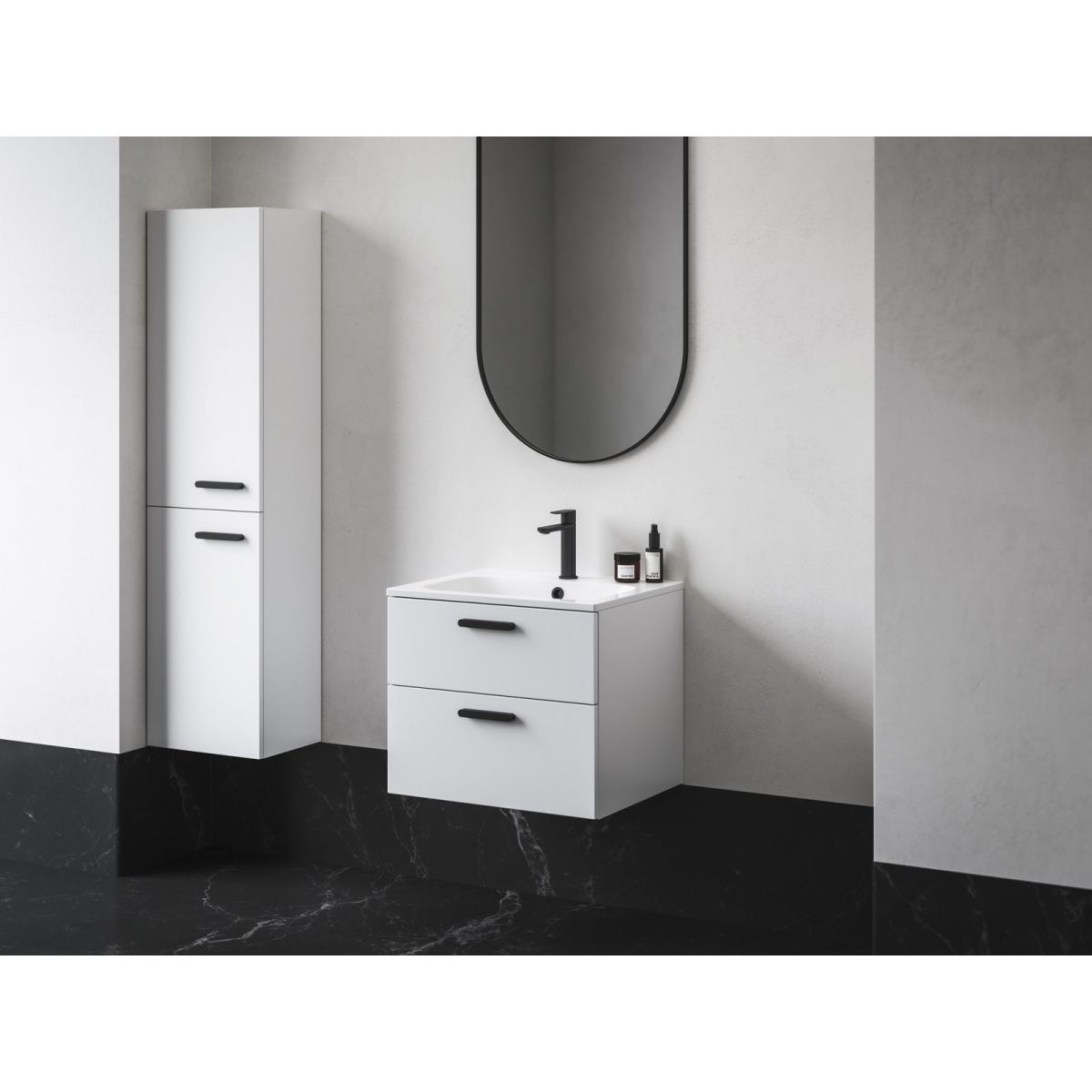 Pentru a ne asigura că nu sunteți distras de nimic în baie, am echipat ușile dulapurilor înalte cu amortizoare de închidere, iar sertarele cu un sistem de închidere automată cu acces liber. Acestea se deschid cu mânere metalice subțiri în trei culori la alegere.