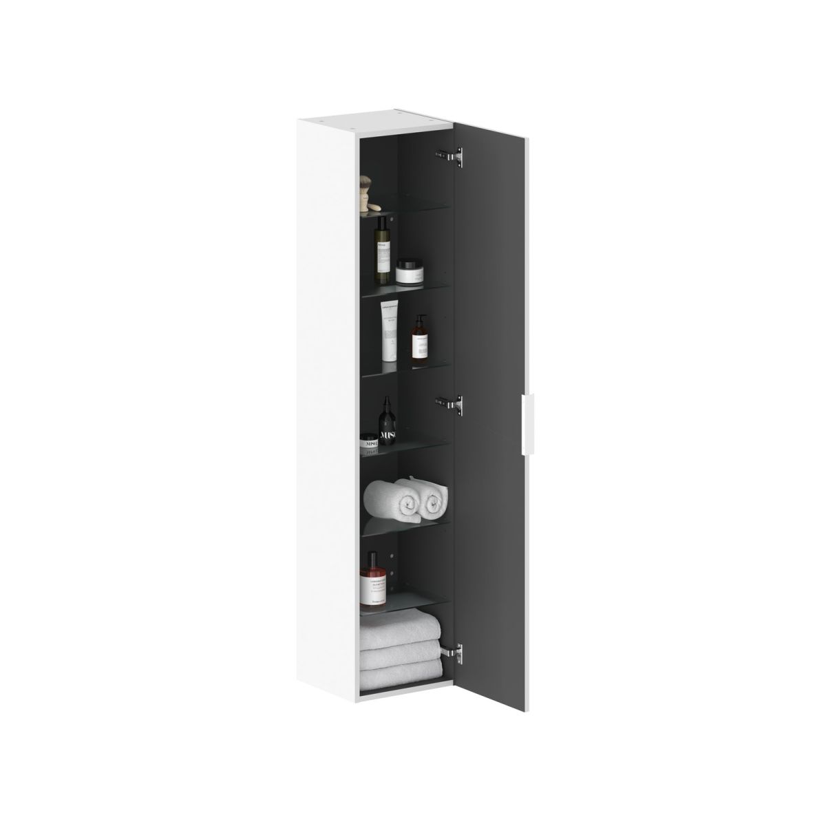 Piedestal de baie SB Comfort II 35 cu șase rafturi din sticlă. Interiorul este realizat în culoarea grafit. Dulapul are găuri pre-perforate pentru un mâner, care nu este inclus și trebuie achiziționat separat. Există posibilitatea de a alege dintre trei culori: crom lucios, negru sau alb.