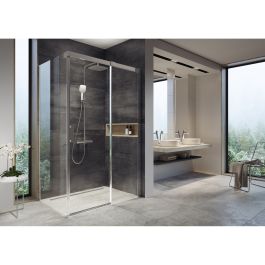 Cabină de duș Matrix cu colțuri, din crom lucios, cu panouri din sticlă transparentă, prevăzute cu strat protector Ravak AntiCalc®. Sistem de deschidere glisant. Versiune pentru dreapta.