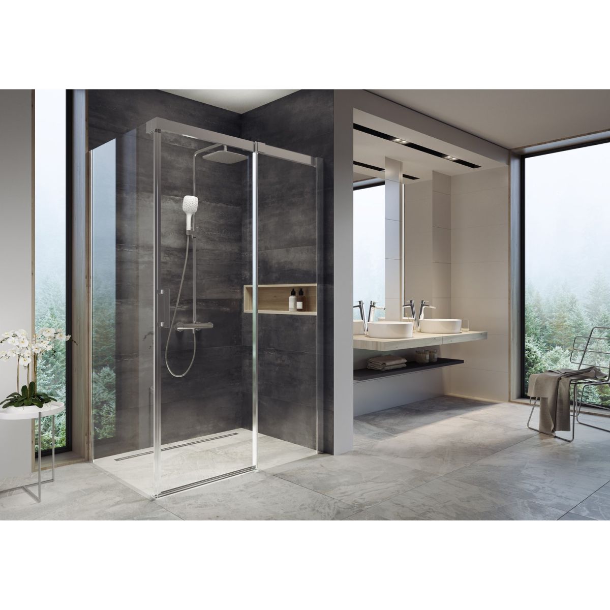 Cabină de duș compusă dintr-o ușă de duș din două părți, cu un element mobil care formează o ușă glisantă și un perete fix dintr-o singură bucată. Instalare într-un colț de baie cu gresie, direct pe podea, cu un canal de scurgere liniar încorporat sau grătar de scurgere.