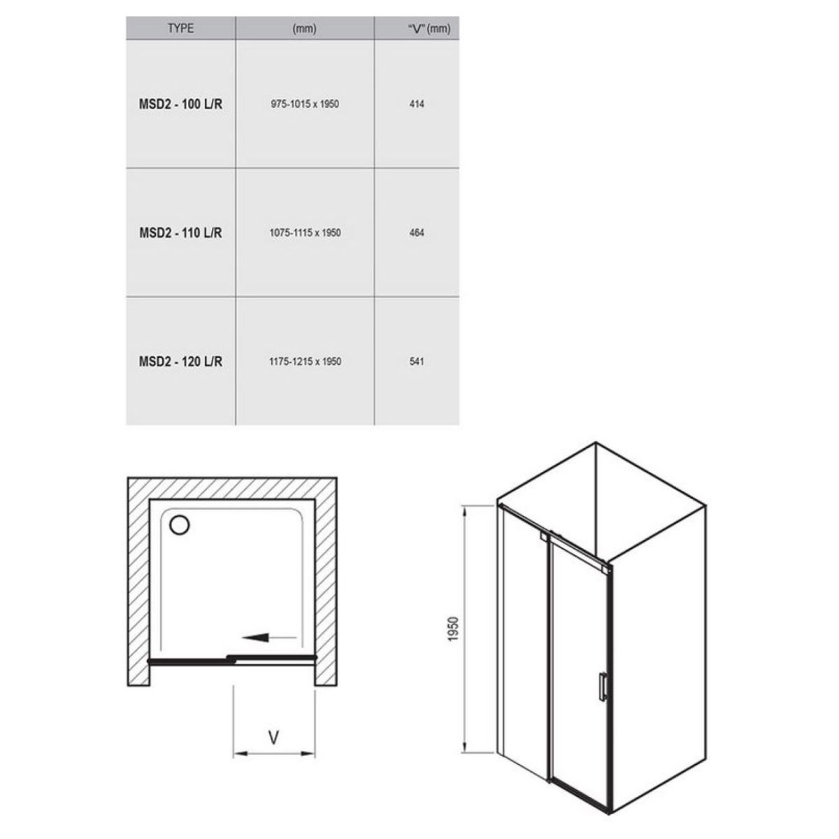 Produsul este format din două părți, dintre care una este o ușă glisantă. Instalare într-o nișă direct pe podea, cu un canal de scurgere liniar încorporat sau grilă de scurgere.