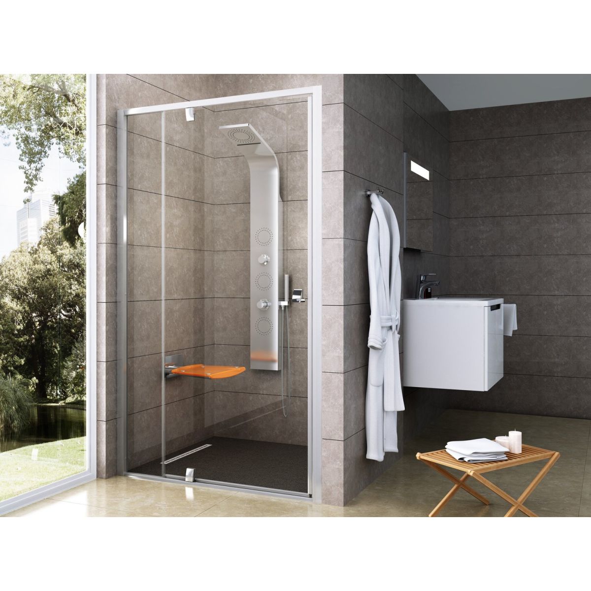 Ușă de duș pivotantă din două părți, cu cadru finisat crom lucios, mâner și balamale cromate. Umplută cu sticlă transparentă cu strat protector Ravak AntiCalc®. Sistem de deschidere: balama pivotantă. Produsul nu are versiune dreapta sau stânga.
