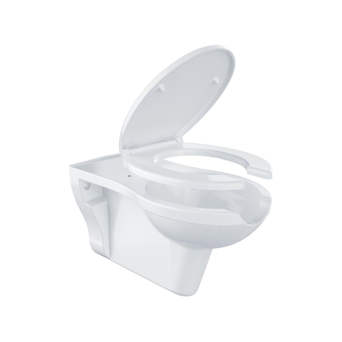 Vas de toaletă cu decupaj în partea din față. Decupajul facilitează igiena și oferă un confort sporit, în special pentru persoanele cu mobilitate redusă sau care au dificultăți în a se apleca. Designul fără margine permite spălarea întregii suprafețe. Vasul este conceput pentru a fi agățat pe perete.