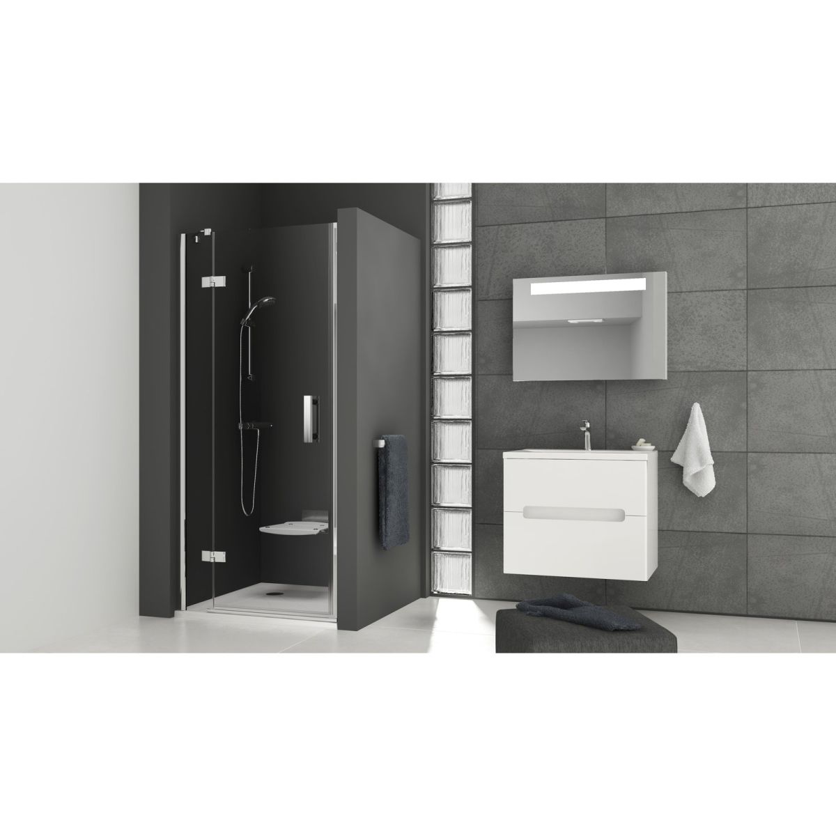 Ușă de duș SmartLine din două părți, din crom lucios, cu umplutură din sticlă transparentă și strat protector Ravak AntiCalc®. Sistem de deschidere cu balamale. Versiune pentru stânga.