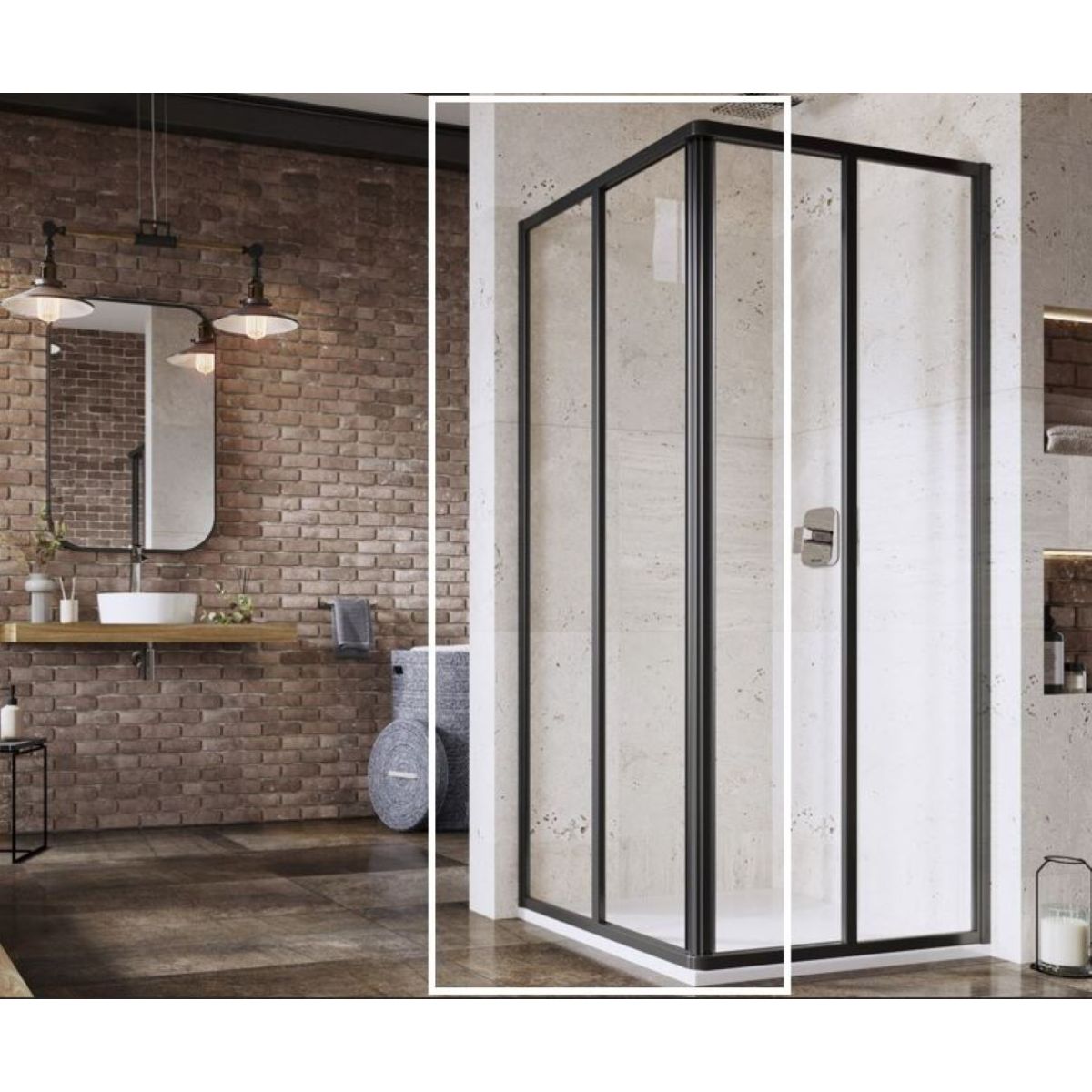 Cabină de duș Supernova 1/2 colț, de culoare neagră, cu panouri din sticlă transparentă, prevăzute cu strat protector Ravak AntiCalc®. Sistem de deschidere glisant.