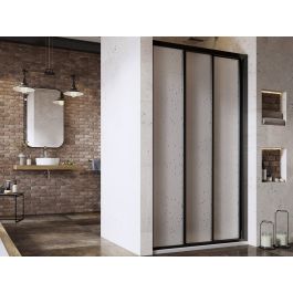 Ușă de duș Supernova din trei părți, cu finisaj negru și umplutură din plastic cu decor Pearl. Sistem de deschidere glisant. Produsul nu are versiune dreapta sau stânga.