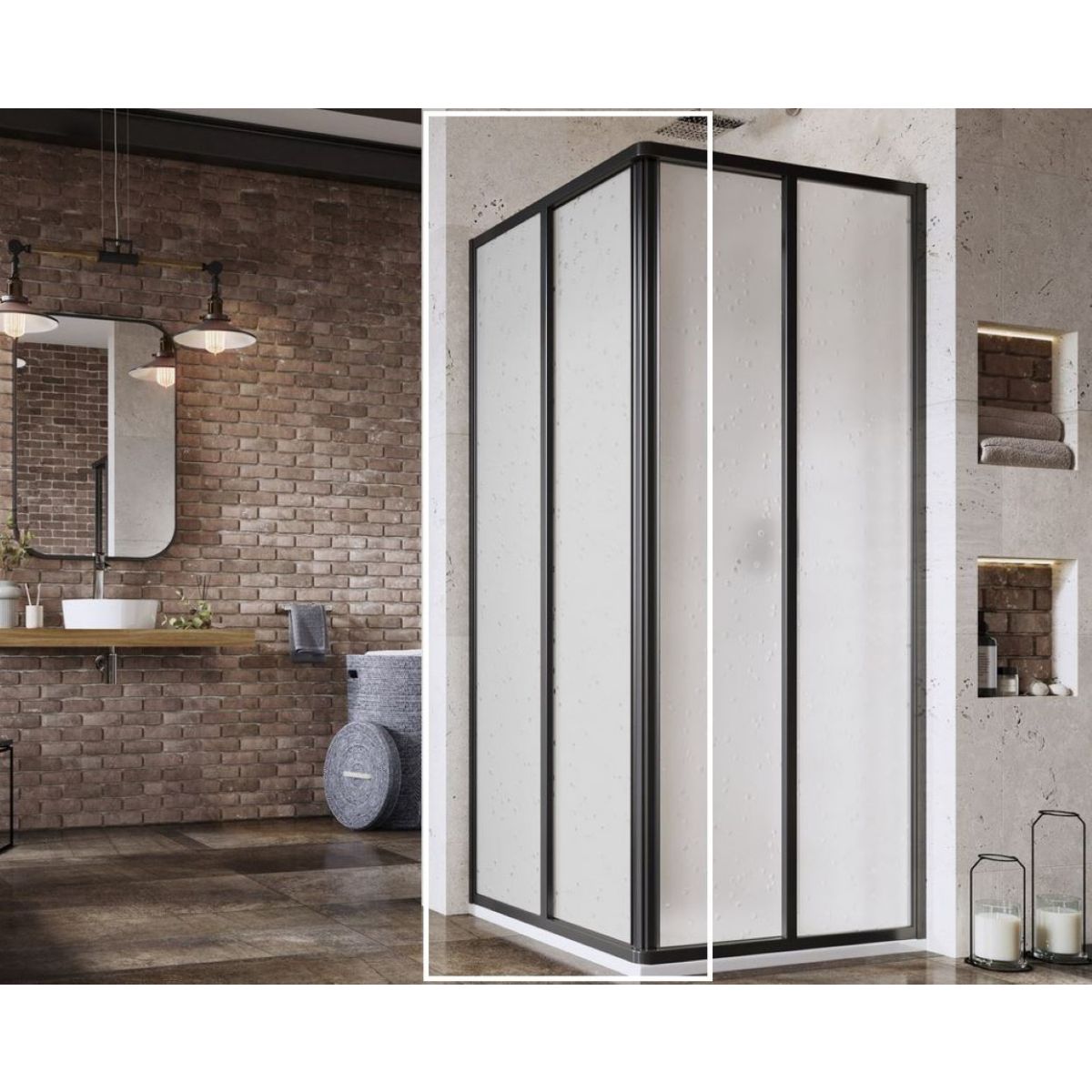 Cabina de duș completă este formată din două uși glisante, care trebuie achiziționate separat. Instalare într-un colț cu gresie al băii, direct pe podea, cu un canal de scurgere liniar încorporat sau grătar de scurgere. Folosind profilul de extensie NPS, produsele pot fi extinse cu 20 mm, permițându-le să se potrivească perfect pe suprafețe inegale de până la 4 cm pe fiecare parte.