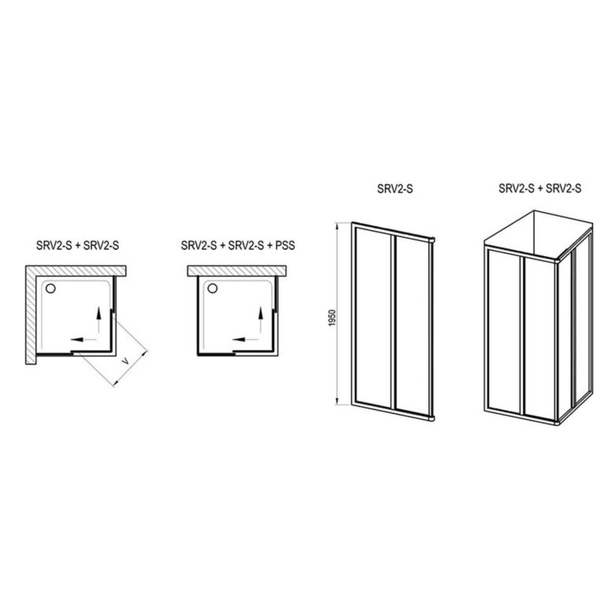 - cabina de duș SRV2+SRV2 poate fi combinată pe o parte cu un perete fix PSS pentru a crea un spațiu în formă de U (este necesar un singur perete pentru a crea un spațiu complet de duș)
