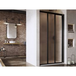 Ușă de duș Supernova din trei părți, cu finisaj negru, cu geam opac cu decor Grape și strat protector Ravak AntiCalc®. Sistem de deschidere glisant. Produsul nu are versiune dreapta sau stânga.