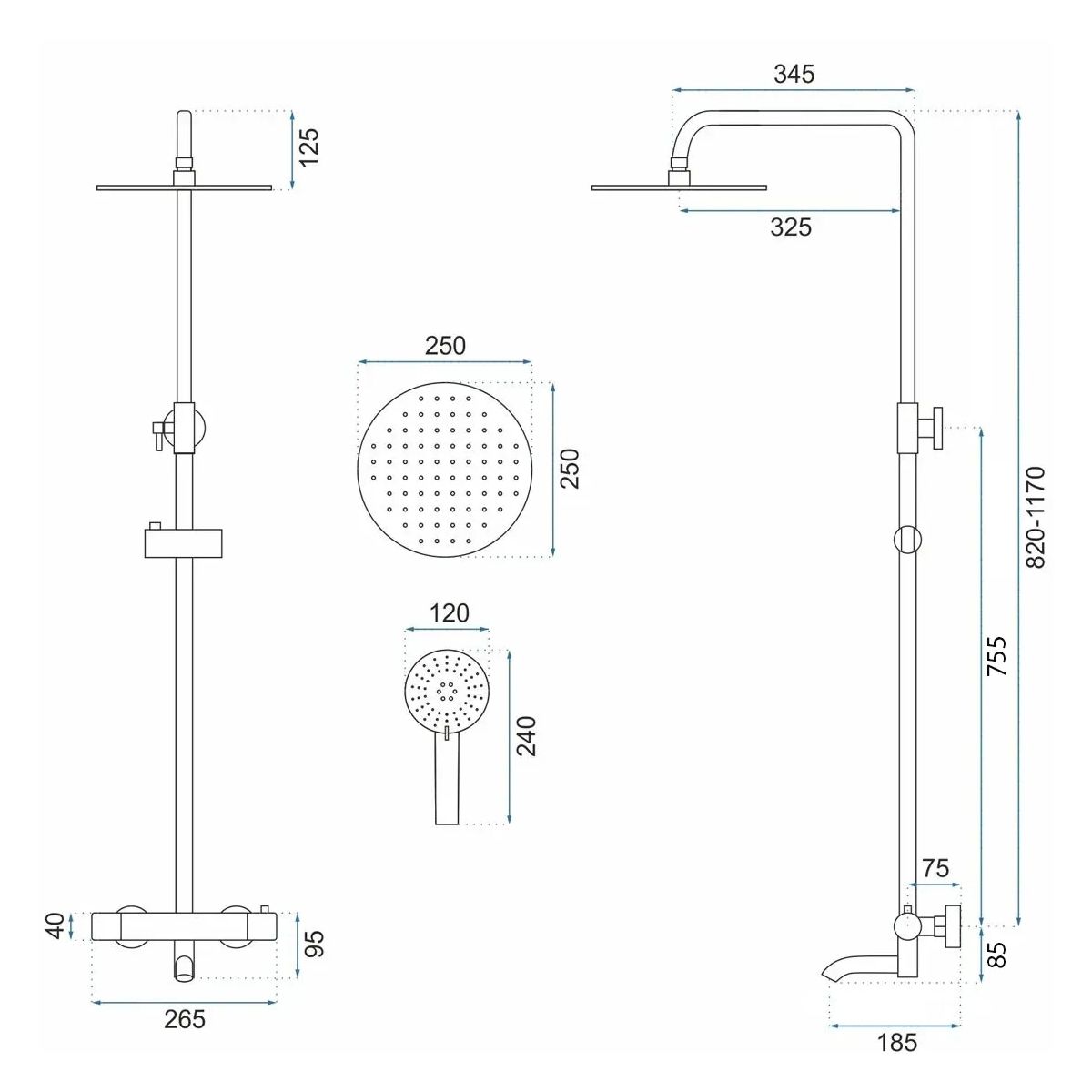 - Inclus: baterie cu comutator, duș ploaie, duza de cadă, duș de mână, furtun de duș, tija de duș