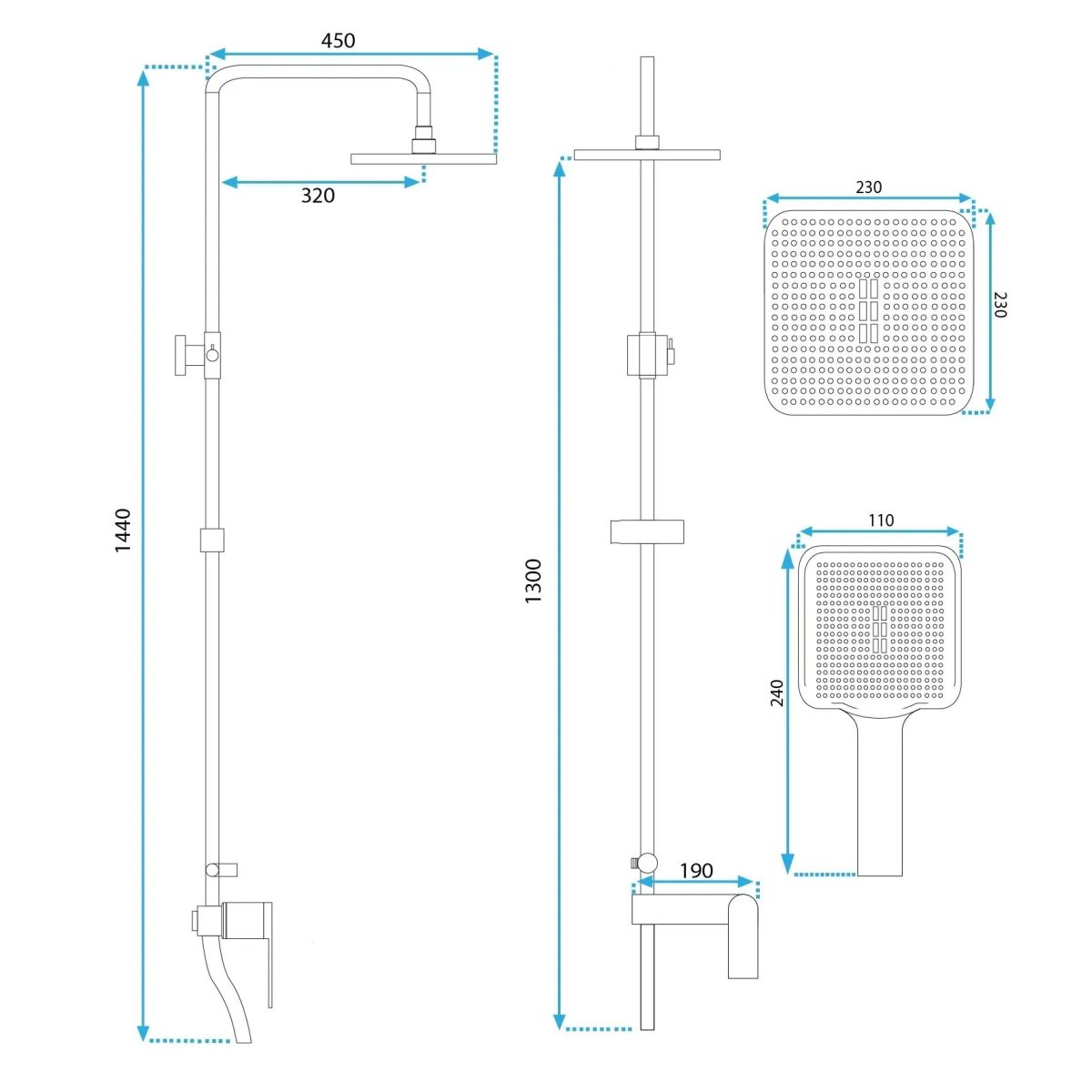 - Inclus: baterie cu comutator, duș ploaie, duza de cadă, duș de mână, furtun de duș, tija de duș